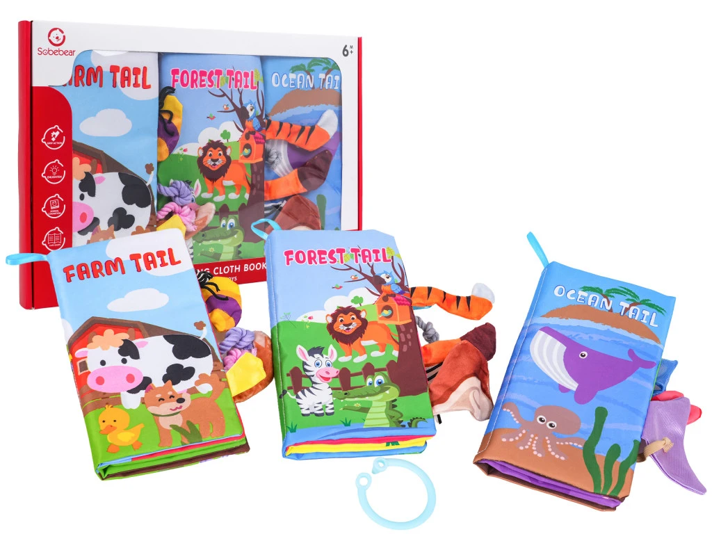 Puha érzékszervi könyvek készlet babáknak hat hónapos kortól. A legkiválóbb minőségű, bababarát anyagokból készült, a készlet susogó, puha tapintású lapokat tartalmaz, amelyek több szinten stimulálják a baba érzékszerveit. Az élénk színek vonzzák a baba figyelmét és ösztönzik a tanulságos játékot. A puha oldalakon számos állat illusztrációja látható. Az első könyv erdei állatokat, a második haszonállatokat, a harmadik pedig különféle tengeri élőlényeket ábrázol. Minden állat angol felirattal van ellátva. Minden oldalból különböző anyagokból készült farkak állnak ki. A könyvek vízállóak és könnyen tisztíthatók.Jellemzők:- hat hónapos kortól alkalmas gyermekek számára,- biztonságos anyagokból készült,- puhák és vízállóak,- különféle állatokról készült rajzaik vannak,- megtanítani az állatok angol elnevezését,- mindkét oldalon más-más állat farka lóg ki,- erdei állatokról, tengeri állatokról vagy szafari állatokról beszélgetnek,- minden könyv első és utolsó oldala zizeg.Méretek:- összehajtott könyv (szárnyak nélkül) kb. 23 cm x 12,5 cm x 3 cm,- csomagolás kb. 36 cm x 24 cm x 3 cm.