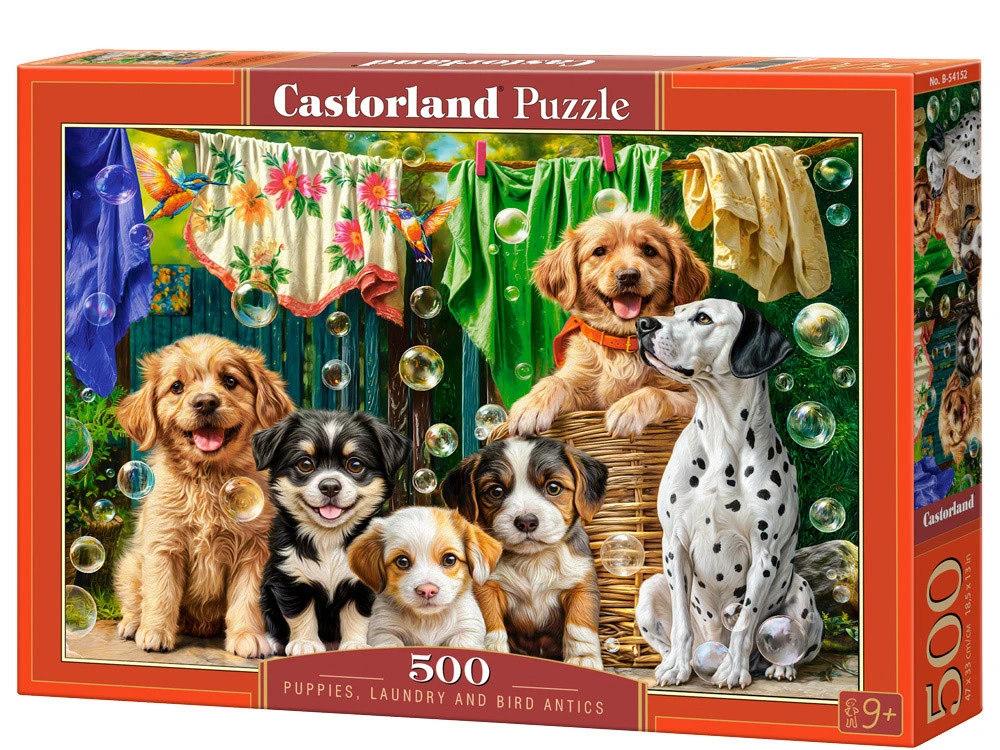 500 darabos kiskutyák, mosoda és madárviccák kirakó B-54152Fedezz fel egy bájos jelenetet, tele huncut kiskutyákkal és játékos madarakkal! Ez a kirakós készlet 500 gondosan kidolgozott darabból áll, amelyek összerakva egy 47 x 33 cm-es képet alkotnak. Tökéletes az állatbarátok számára, és egy pihentető módja annak, hogy eltöltsék az időt egy kirakó összerakásával.A kirakós összerakása nemcsak szórakoztató, hanem számos készség fejlesztésének is módja:elősegíti a koncentrációt és a türelmet,fejleszti a megfigyelőképességet és a képzelőerőt,fejleszti a kéz-szem koordinációt és a logikus gondolkodást.A kirakók kiváló minőségű, tartós és biztonságos anyagokból készültek, az élénk színek és a darabok pontos illeszkedése pedig igazi élvezetet nyújt az összerakásukhoz.Ez a tökéletes ajándékötlet minden korosztályú állat- és kirakós rajongónak ndash; garantáltan órákig tartó kikapcsolódást és elégedettséget nyújt a teljes kép megrajzolása után.