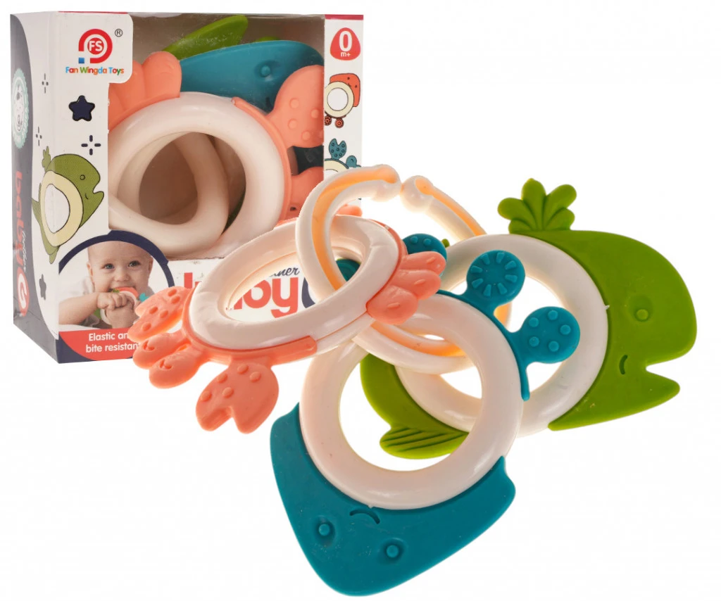 Állatos rágóka babáknak az élet első napjaitól. Biztonságos, finomítja a fogást, segít felismerni a színeket és formákat, nélkülözhetetlen a fogzás során. A játék három műanyag gyűrűből áll, amelyeken gumi kiemelkedések vannak, amelyek tengeri állatokra, például rákra, polipra vagy delfinre emlékeztetnek. A játék megrázása után a gyermek csörgő hangot hall.Készlet jellemzői:- csecsemőknek ajánlott az élet első napjaitól kezdve,- megtanítja a színeket, formákat,- gyakorolja a megragadó reflexet,- hasznos a fogzás során,- rázásra halkan csörög,- Kizárólag babák számára biztonságos anyagokból készültMéretek:- játék kb. 15 cm x 11 cm x 3 cm, kerék átmérője kb. 5,5 cm,- csomagolás kb. 8,2 cm x 4,8 cm x 8,5 cm