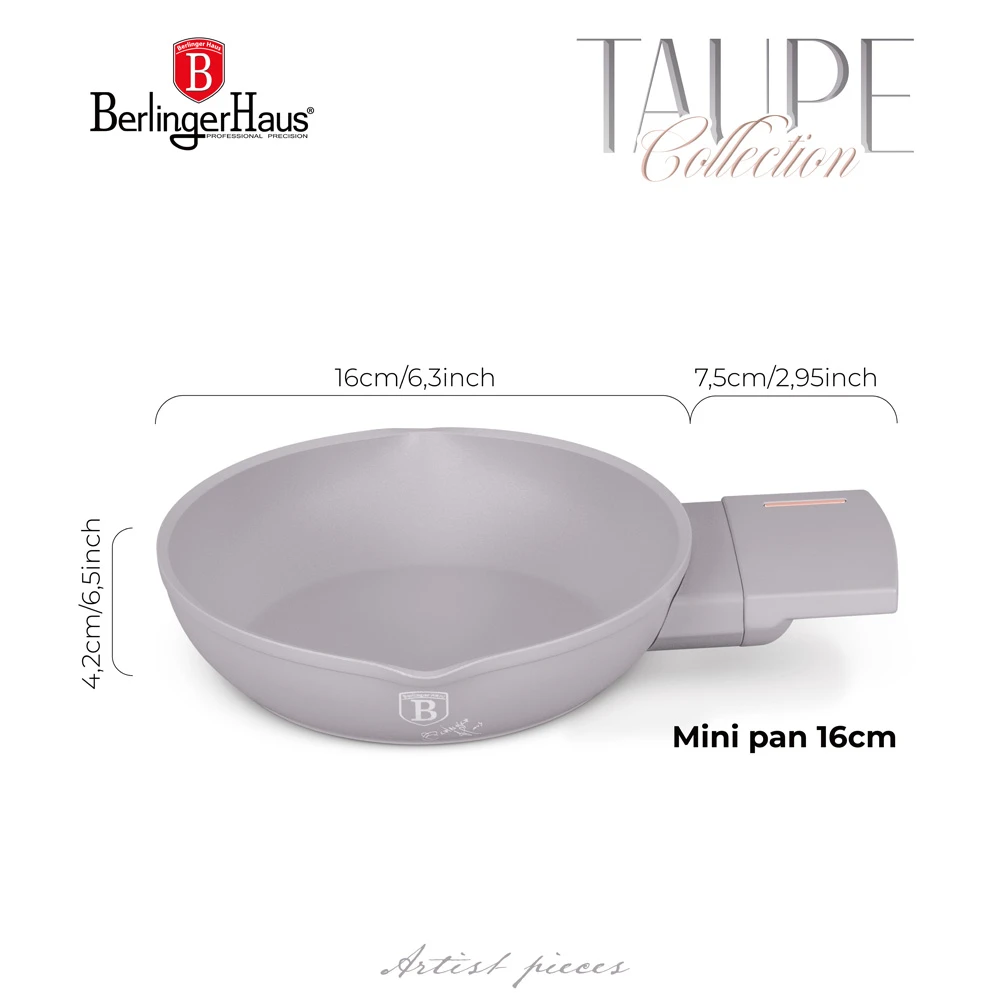 A Taupe Collection Mini serpenyő (16 cm) egy kiváló minőségű és környezetbarát konyhai eszköz, amely a letisztult stílusával és praktikus tulajdonságaival tökéletes választás a mindennapi főzéshez. A BerlingerHaus termékcsalád részeként harmonikusan összehangolható más konyhai eszközökkel is.