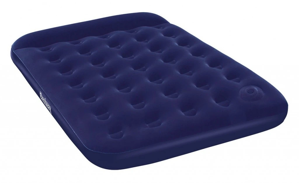 Nagyméretű felfújható csúcsminőségű matrac kék színben, beépített párnával, velúr borítású fekvőfelülettel, oldal fallal, kül- és beltéri használatra.