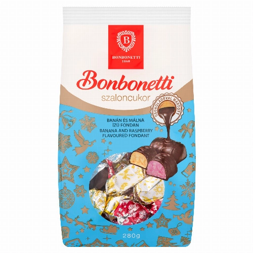 - Étcsokoládéval mártott (22%) banán és málna ízű fondanszaloncukor.