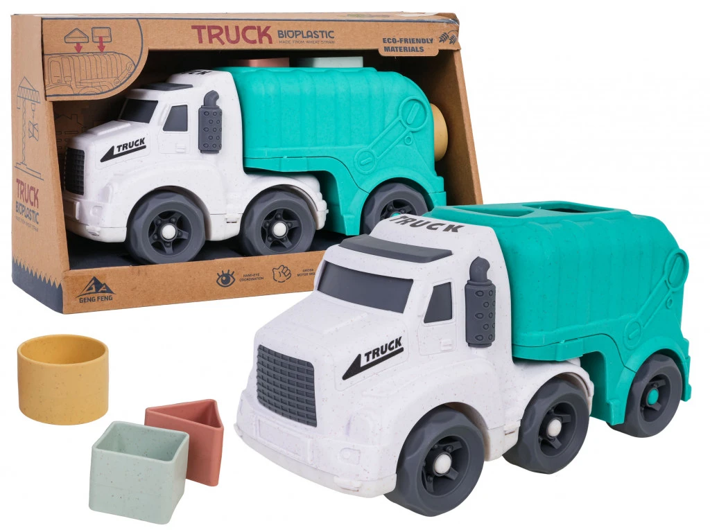 Ez a válogatóval és építőkockákkal ellátott szemetesautóbioműanyagból készült, és tizennyolc hónapos vagy annál idősebb gyermekek számára alkalmas. Környezetbarát sorozat része. A teherautót a részletekre való odafigyeléssel tervezték, gyönyörű, élénk színekkel büszkélkedhet, és mentes az éles szélektől. A teherautó tetején és hátsó ajtaján egy formaválogató található, és az építőkockák is benne vannak.Jellemzők:- tizennyolc hónapos kortól gyermekek számára alkalmas játék,- bioműanyagból készült,- alakváltó a tetőn és a csomagtérajtón,- a hátsó fedél kinyílik, hogy könnyen hozzáférhessen a blokkokhoz,- levehető szemeteskocsi utánfutó,A játéknak nincsenek éles szélei,- beltéri és kültéri játékra egyaránt alkalmas.Méretek:- szemeteskocsi kb. 25 cm x 13 cm x 11 cm,- csomagolás kb. 29,5 cm x 17,7 cm x 11,7 cm