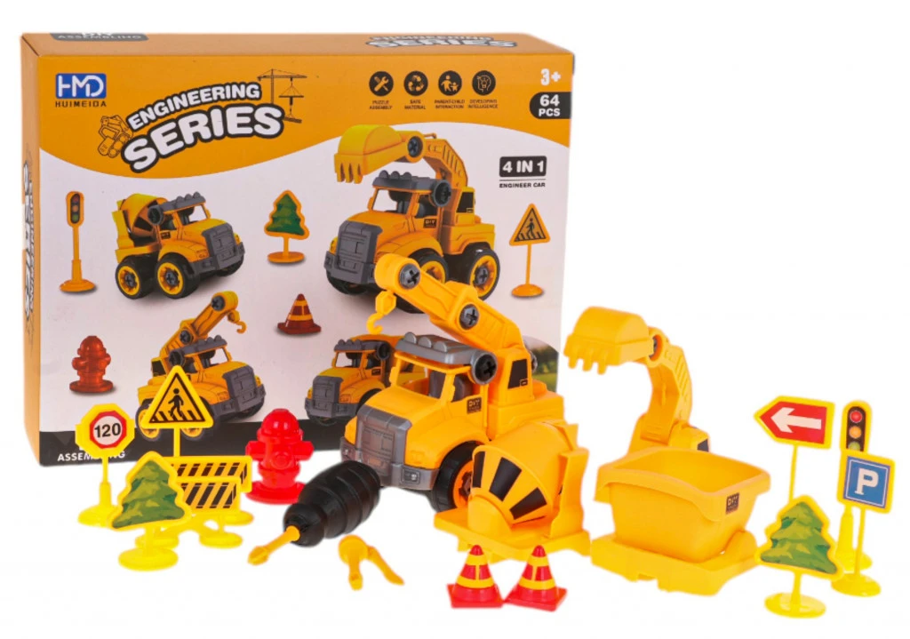 4 az 1-ben építőipari jármű készlet kiegészítőkkel 3 éves kortól gyermekek számára. A készlet a legmagasabb minőségű műanyagból készült. A cserélhető elemeknek köszönhetően az építőipari autó átalakítható vagy szétszerelhető alkatrészekké. A készlet tartalmaz egy csavarhúzót cserélhető dugókulcsokkal.Készlet jellemzői:- 3 éves kortól gyermekek számára készült,- a legmagasabb minőségű műanyagból készült,- 4 az 1-ben: kotrógép, daru, betonkeverő, dömper,- a jármű alkatrészeire szétszerelésének lehetősége,- cserélhető hegyű csavarhúzó mellékelve,- mozgatható elemek: gém, betonkeverő, pótkocsi, kotrógép kanálMéretek:- billenő kb. 12 cm x 8,5 cm x 8,2 cm,- kotrógép kb. 10,5 cm x 8 cm x 11,5 cm,- betonkeverő kb. 12 cm x 8 cm x 9,5 cm,- daru kb. 10,5 cm x 8 cm x 12 cm,- kb. 6,5 cm x 3 cm-es csavarhúzó,- csomagolás kb. 27,5 cm x 20,7 cm x 7,3 cm