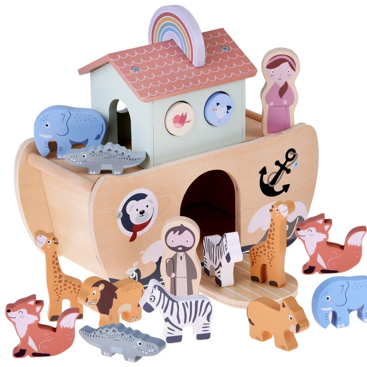 Színes, fából készült Noé bárkája állatfigurákkal ndash; pasztell színekben, nagyszerű szórakozás a gyerekeknekEgy gyönyörű, színes, fából készült Noé bárkája egy klasszikus oktatójáték, amely minden gyermeket el fog kápráztatni, és kreatív, oktató jellegű játékra ösztönöz.