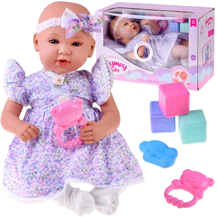 Gyönyörű baba ndash; Interaktív, kiegészítőkkelEz az imádnivaló baba minden gyermeket elbűvöl valósághű arcával, hosszú szempilláival és élethű szemeivel. Puha pocakja, gumiból készült karjai, lábai és feje tökéletessé teszik az öleléshez és a mindennapi játékhoz.A baba egy bájos, lila ruhát visel, melyet apró lila és rózsaszín virágok díszítenek. Öltözékét egy többrétegű, ugyanilyen mintázatú masnival ellátott csipke fejpánt egészíti ki, amelyet finom részletek, például csipkebetétek és hímzett virágmotívumok gazdagítanak. A szett puha fehér zoknikat és fehér bugyit is tartalmaz, amelyek teljessé teszik bájos megjelenését.A babába rejtett interaktív hangmodulnak köszönhetően a játékidő még realisztikusabbá válik. A modul megnyomásával a gyerekek különféle babahangokat hallhatnak, például:nevetésgagyogás (2 különböző hang)horkolásquot;mamaquot;sírótüsszentésbdquo;apardquo;köhögéscsuklásA modul CR2032 elemekkel működik (a készlet tartalmazza).A babán kívül a készlet elbűvölő babakiegészítőket is tartalmaz, amelyek fokozzák a játékélményt, és lehetővé teszik a gyerekek számára, hogy igazi gondozóknak érezzék magukat. A készletben három pasztellszínű, számokkal ellátott építőkockát, egy rózsaszín mackó alakú csörgőt és egy édes kis elefánt játékot találsz. Minden kiegészítő lágy pasztellszínekben készült, tökéletesen illenek a babához, és harmonikus, bájos készletet alkotnak.A teljes készlet egy elegáns dobozban érkezik, így kiváló ajándékötlet.A készlet tartalma:babababa ruhában (ruha, alsónadrág, zokni, fejpánt)3 pasztellblokkmackó csörgőelefántjátékEz a baba biztosan elbűvöli majd minden kislányt, és végtelen órányi örömteli játékot biztosít majd.