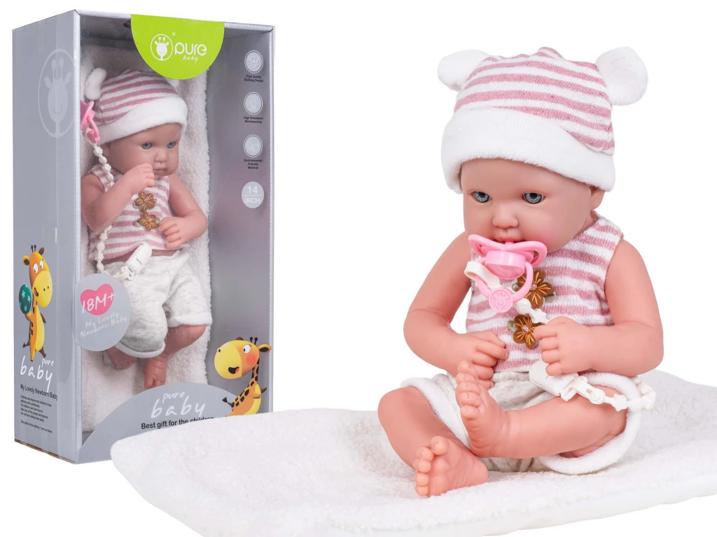 Egy gyönyörű, realisztikusan kidolgozott baba kiegészítőkkel három éves kortól. A baba sapkát, pólót és rövidnadrágot visel. Mozgatható karjai és lábai vannak, és nagyon puha tapintású. A csomag tartalmaz egy zsinóros cumit és egy puha takarót. A baba hihetetlenül realisztikusan néz ki, akárcsak egy igazi kisbaba.Jellemzők:- hároméves kortól gyermekek számára,- realisztikus megjelenés,- tartozékok mellékelve,- tökéletes ajándékcsomag.Méretek:- baba kb. 33 cm x 16 cm x 12 cm,- takaró kb. 43 cm x 23 cm x 0,5 cm,- csomagolás kb. 43,2 cm x 23,5 cm x 14 cm