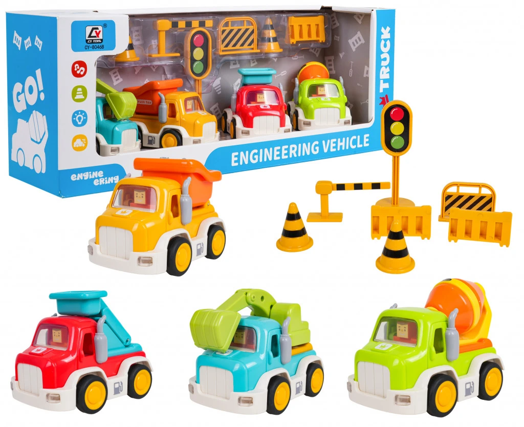 Interaktív építőipari járművek hang- és fényeffektusokkal három éves vagy annál idősebb gyermekek számára. A készlet kiváló minőségű műanyagból készült, élénk színű. A járművek mozgó alkatrészekkel, hangeffektusokkal és világító első lámpákkal rendelkeznek. A kerekek gumiból készültek a jó tapadás érdekében, a meghajtás pedig biztosítja a sima mozgást. Minden járművet 3 db AG13 elem működtet (tartozék). A készlet tartalmaz építési kiegészítőket is, például sorompókat és közlekedési lámpákat, valamint egy játékszőnyeget, amelyen út, parkoló, épületek és építkezés rajzai láthatók.Jellemzők:- hároméves kortól ideális gyermekek számára,- a legjobb minőségű műanyagból készült,- mozgatható elemek: mozgatható pótkocsi (billenőplatós), mozgatható létra kosárral (daru), mozgatható betonkeverő (betonkeverő), mozgatható kanál forgókabinnal (kotró), emelőkorlát,- gumiabroncsok,- hátsókerék-meghajtás,- hangeffektek: vidám dallamok,- fényeffektusok: villogó fényszórók,- további kiegészítők: közlekedési lámpák, sorompók, bóják, útburkolati jelek, épületek és építési területek.Méretek:- billenőplató kb. 10,5 cm x 8 cm x 7,5 cm,- betonkeverő kb. 10,5 cm x 8,5 cm x 7,5 cm,- kotrógép kb. 10,5 cm x 9,5 cm x 7,5 cm,- daru kb. 10,5 cm x 9 cm x 7,5 cm,- kb. 76,5 cm x 52 cm-es betétlap,- csomagolás kb. 48 cm x 18 cm x 13 cm.