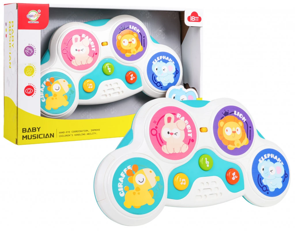 Interaktív, érintésérzékeny dobkészlet tizennyolc hónapos kortól babáknak. A legkiválóbb minőségű anyagokból készült, ennek a játéknak nincsenek éles szélei. A hang- és fényhatások, valamint a gazdag színpaletta több szinten stimulálja a baba érzékszerveit. Az érintésérzékeny dobok vidám állatok színes képeit ábrázolják: zsiráfot, nyúlt, oroszlánt és elefántot. Megnyomásukra állathangok, dallamok, dobritmusok játszódnak le, és színes fények villognak a játék oldalán végig. A játék 3 db 1,5 V-os AAA elemmel működik (nem tartozék).Jellemzők:- tizennyolc hónapos kortól gyermekek számára készült játék,- a legjobb minőségű anyagokból készült, nincsenek éles végei,- fényhatások: villogás a játék teljes hosszában,- hangeffektek: dallamok, állathangok, dobhangok,- hangerőszabályzó,- a játék több szinten stimulál.Méretek:- dobok kb. 32 cm x 17 cm x 4 cm,- csomagolás kb. 36,5 cm x 8 cm x 23,5 cm