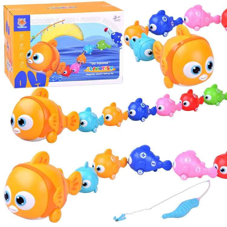 Interaktív halcsaládDobd be a zsinórodat, és fogj meg egy színes halat! Vagy talán mindet elkaphatod? A titok a halak szájában és a horgászbot horgában elrejtett okos mágnesekben rejlik, amelyek egyszerűvé és szórakoztatóvá teszik a horgászatot.De ez csak a kezdet! A nagy hal különleges interaktív funkciókkal rendelkezik ndash; mozoghat, világíthat és vidám zenét játszhat, így a játékidő még izgalmasabbá válik.Fedezze fel színes halcsaládunk összes jellemzőjét:A nagy halat 3 times; 1,5 V-os AA elem táplálja (nem tartozék). Miután behelyezte az elemeket és megnyomta a hátán lévő egyik uszonyt, a hal elkezd mozogni, szemei színes fényekkel világítanak, és vidám zene szólal meg.A kisebb halakat beépített mágnesek segítségével rögzítheted a nagyhoz ndash; mindegyiknek van egy mágnese a szájában és a farokban, így egy hosszú, mókás bdquo;kígyóvárdquo; kötheted össze őket.Amikor a nagy hal megmozdul, a kisebbek követik, annak ellenére, hogy nincsenek bennük elemek ndash; mágnesekkel összekapcsolva simán gurulnak kis kerekeiken.Minden hal, kicsi és nagy egyaránt, kerekekkel van felszerelve, így szabadon mozoghatnak a padlón.Minden kis halon két nyomtatott szám található, amelyek segítenek a gyerekeknek megtanulni felismerni és sorrendbe állítani a számokat.A kisebb halakat a mágneses horgászbottal is ki lehet fogni, ami segít a gyerekeknek a pontosság és a kéz-szem koordináció gyakorlásában.Méretek:Nagy hal: 19 cm times; 10 cm times; 13 cmKis hal: 9,5 cm times; 5 cm times; 5,5 cmHorgászbot zsinórral: 56 cm times; 2,5 cm times; 2,5 cmA készlet tartalma:1 times; Nagy hal6 times; Kis hal1 times; HorgászbotOktatási előnyök: