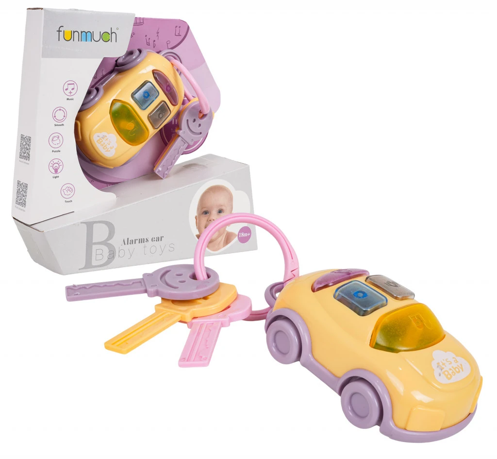 Interaktív, jármű alakú kulcstartóból és kulcsokból álló készlet tizennyolc hónapos kortól gyermekek számára. Bababarát anyagokból készült, a játéknak nincsenek éles szélei. Az autó tetején található gombok hangeffektusokat aktiválnak: csengő, indítási hang, autónyitási hang és kürt. A lámpák is villognak. A játék 2 db 1,5 V-os AAA elemmel működik (nem tartozék).Jellemzők:- tizennyolc hónapos kortól gyermekek számára alkalmas készlet,- biztonságos anyagokból készült,- hangeffektusok: csengőhang, járműindítási hang, autónyitási hang és sípoló hang,- villogó fények a jármű tetején.Méretek:
