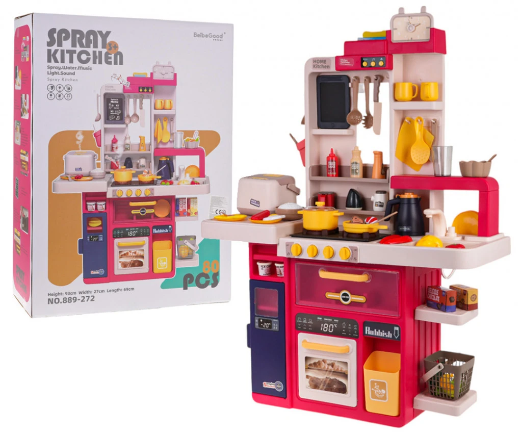 Interaktív konyha fénnyel, gőzzel, hanggal és vízcsappal, valamint számos kiegészítővel, 3 éves kortól gyermekek számára. A konyha kiválóan elkészített, a legjobb minőségű műanyagból készült, és élénk színekben kapható, amelyek játékra ösztönzik a gyermeket. A konyhapulton egy interaktív tányér található égőfejekkel. Az egyik gomb elforgatása után főzési hangokat, a másik gomb elforgatása után pedig sütés hangjait hallhatjuk. A főzési és sütési hangokat az égőfejek háttérvilágítása kíséri. Ezenkívül gőz távozik a serpenyőből vagy fazékból. A csapból valóban víz folyik ki, mint egy igazi mosogatóban, így a gyermek elmosogathatja a játék edényeket. A készlet tartalmaz egy krétatáblát is, amelyre elkészíthetünk például egy receptet vagy egy bevásárlólistát. A készlet tartalmaz egy nyitható ajtós hamis hűtőszekrényt, egy nyitható sütőt és rengeteg polcot, amelyekre hamis termékeket helyezhetünk. A konyhabútor tetején egy zenei panel található gombokkal, amelyek aktiválják a páraelszívó által kiadott különböző dallamokat és hangokat. A készlet tartalmaz egy rizsfőzőt is, amelyből biztonságos gőz szabadul fel, éskülönféle főzési hangok hallhatók. A teljes készlet remekül néz ki. A teljes készlet 9 db AA 1,5 V-os elemmel működik (nem tartozék).Készlet jellemzői:- 3 éves kortól alkalmas gyermekek számára,- a legjobb minőségű műanyagból készült élénk színekben,- gazdagon felszerelt, a készlet akár 80 elemből is áll,- mozgatható gombok,- háttérvilágítással ellátott égők,- sütési és főzési hangok,- biztonságos gőz távozik a serpenyőből vagy fazékból,- Biztonságos gőz távozik a rizsfőző edényből, és főzési hangok hallhatók.- folyóvízzel ellátott csap,- hűtőszekrény kinyitása,- sütő kinyitása,- nyitható polc,- mozgó mutatós óra,- krétatábla,- egy panel a motorháztető által kiadott dallamokkal és hangokkal.Méretek:- konyha kb. 93 cm x 27 cm x 69 cm,- krétatábla kb. 13 cm x 9 cm,- szivacs kb. 7 cm x 4 cm x 1,5 cm,- krétatartó kb. 8 cm x 2,5 cm x 1 cm,- rizsfőző edény füllel, kb. 12 cm x 9,5 cm,- rizses tál kb. 4 cm x 7,5 cm,- kosár füllel kb. 8,5 cm x 9,5 cm,- kb. 10 cm x 9 cm-es vízforraló,- serpenyő kb. 13 cm x 8 cm x 2 cm,- fedővel ellátott edény, kb. 6 cm x 11 cm,- olajtartály kb. 7 cm x 3 cm,- szójaszószos tartály kb. 5,5 cm x 4,5 cm,- egy kb. 8 cm x 3 cm-es salátaöntet-tartó,- kb. 5 cm x 4 cm-es füles csésze,- kb. 3 cm x 3,5 cm-es fagylaltkosarak,- átlátszó pohár, kb. 6,5 cm x 5 cm,- cukortartó kanállal kb. 5,5 cm x 5 cm,- egy kb. 8 cm átmérőjű tányér,- tál kb. 8 cm x 3,5 cm,