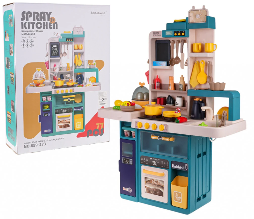 Interaktív konyha fénnyel, gőzzel, hanggal és vízcsappal, valamint számos kiegészítővel, 3 éves kortól gyermekek számára. A konyha kiválóan készült, a legjobb minőségű műanyagból, élénk színekkel, amelyek játékra ösztönzik a gyermeket. A konyhapulton egy interaktív főzőlap található égőfejekkel. Az egyik gomb elforgatása után főzési hangokat, a másik gomb elforgatása után pedig sütés hangjait hallhatjuk. A főzési és sütési hangokat az égőfejek háttérvilágítása kíséri. Ezenkívül hideg gőz távozik az edényből. A csapból valóban víz folyik ki, mint egy igazi mosogatóban, így a gyermek elmosogathatja a játék edényeket. A készlet tartalmaz egy krétatáblát is, amelyre például recepteket vagy bevásárlólistákat készíthetünk. A készlet tartalmaz egy nyitható ajtós hamis hűtőszekrényt, egy nyitható sütőt és fiókot, valamint rengeteg polcot, amelyekre hamis termékeket helyezhetünk. A készletben található tojásfőző forgó felső résszel, hangokkal és fényekkel rendelkezik. A konyhakészlet tetején egy zenei panel található, amelynek gombjai különböző dallamokat indítanak. Az egész készlet nagyszerűen néz ki. A játék 8 db 1,5 V-os AA elemmel működik (nem tartozék).Készlet jellemzői:- 3 éves kortól alkalmas gyermekek számára,- a legjobb minőségű műanyagból készült élénk színekben,ndash; gazdagon felszerelt, a készlet akár 77 elemből is áll,- mozgatható gombok,- háttérvilágítással ellátott égők,- sütési és főzési hangok,- biztonságos, hideg gőz távozik az edényből,- a tojásfőző hang- és fényfunkciókkal rendelkezik, és a felső része forgatható,- folyóvízzel ellátott csap,- hűtőszekrény kinyitása,- sütő kinyitása,- nyitható polc,- mozgó mutatós óra,- krétatábla szivaccsal és krétával,-egy panel a motorháztető által kiadott dallamokkal és hangokkal,- mozgó mutatókkal rendelkező óra.Méretek:- konyha kb. 93 cm x 27 cm x 69 cm,- tojásfőző kb. 14 cm x 11 cm,- krétatábla kb. 13 cm x 9 cm,- szivacs kb. 7 cm x 4 cm,- krétacsomag kb. 7,5 cm x 2,5 cm,- rizses tál kb. 7,5 cm x 2,5 cm,- kb. 2 cm x 7 cm-es rizs,- vízforraló kb. 10 cm x 6,5 cm,- serpenyő kb. 13 cm x 8 cm x 2 cm,- fedővel ellátott edény, kb. 11 cm x 6 cm,- olajtartály kb. 7 cm x 3 cm,- egy kb. 8 cm x 3 cm-es doboz szójaszósz,- szójaszószos tartály kb. 5,5 cm x 4,5 cm,- ketchup kb. 7,5 cm x 3 cm,- cukortartó kanállal kb. 5,5 cm x 5,5 cm,- kb. 9,5 cm hosszú villa, kanál, kés,- körülbelül 10 cm hosszú kanál,- kb. 14 cm hosszú kés,- húsos spatula, tésztakanál, kb. 12 cm hosszú merőkanál,- tál kb. 7,5 cm x 3,5 cm,- kb. 7,5 cm-es tányér,- sószóró kb. 5,5 cm x 4,5 cm,- kb. 6,5 cm x 5 cm-es csésze,- teáscsésze kb. 3,5 cm x 4 cm x 5,5 cm,- fagylalttartó kb. 3,5 cm x 3 cm,- hulladéktároló kb. 12,5 cm x 9 cm x 6,5 cm,- csomagolás kb. 65 cm x 46,5 cm x 19 cm
