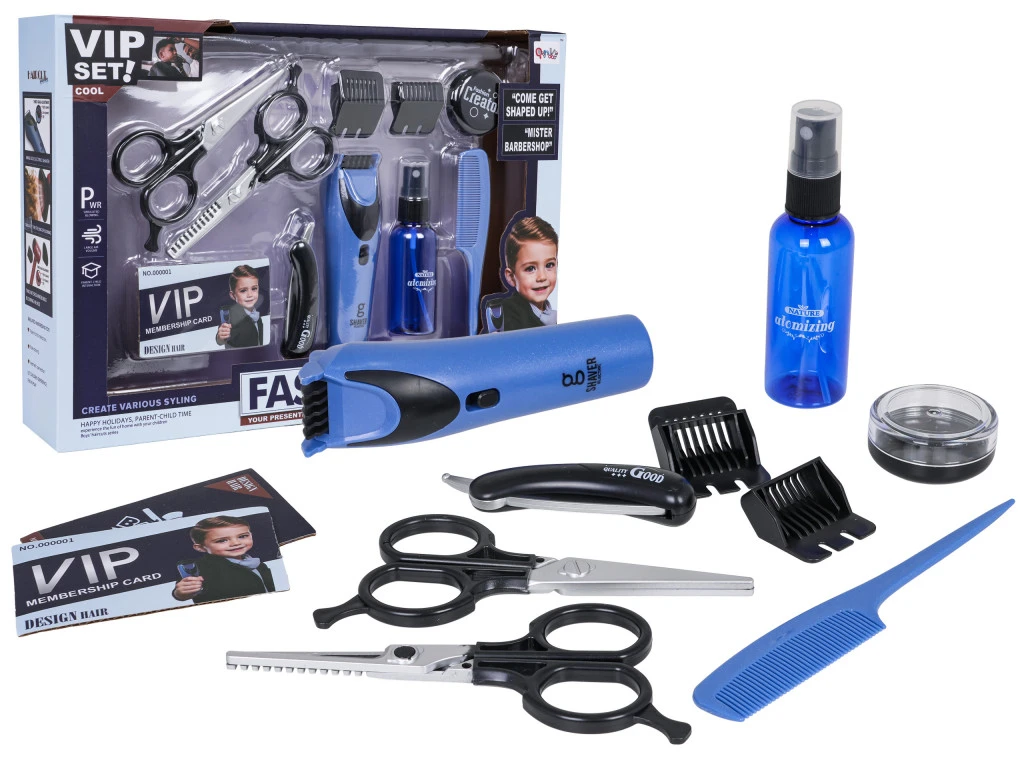 Jól felszerelt borbélykészlet három éves kortól gyermekek számára. A 11 darabos készlet a legmagasabb minőségű anyagokból készült, így hosszú élettartamot biztosít. A készlet tartalmaz egy nyírógépet, kétféle ollót, egy borotvát, két nyírógép-feltétet, kétféle szakállápoló tartályt, egy fésűt és két VIP kártyát. Ezzel az átfogó készlettel gyermeked élvezheti a hajvágást, a formázást és a frizurák készítését. A nyírógép hangeffektusokkal és mozgó pengékkel rendelkezik. 2 db 1,5 V-os AAA elemmel működik (nem tartozék).Készlet jellemzői:- hároméves kortól alkalmas gyermekek számára,- a legjobb minőségű anyagokból készült,- a gazdag felszerelésnek köszönhetően gyermeke igazi borbélynak érezheti magát,A borotva működési zajokat bocsát ki, és mozgó pengékkel rendelkezik.Méretek:- gép kb. 13,5 cm x 4 cm x 4 cm,- borotvahegy kb. 4,5 cm x 3,5 cm,- kozmetikai tároló kb. 11,5 cm x 3 cm,- fésű kb. 14,5 cm x 2,5 cm,- kb. 14,5 cm x 6 cm-es olló,- VIP kártya kb. 8,5 cm x 5,5 cm,- csomagolás kb. 36 cm x 25 cm x 7 cm