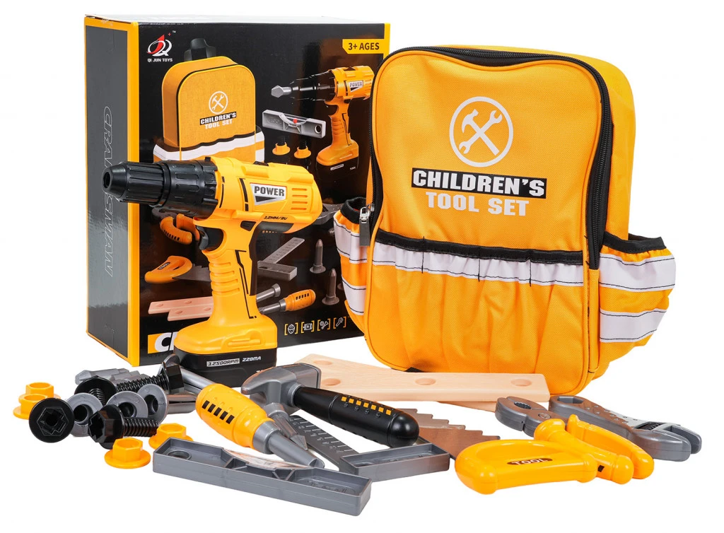 Jól felszerelt szerszámkészlet hátizsákkal és interaktív fúró-csavarozóval három éves kortól gyermekek számára. A készlet kiváló minőségű műanyagból készült. A szerszámos hátizsákegy cipzáras fő rekesszel, kis oldalsó zsebekkel és varrással rendelkezik a szerszámok tárolására. A fúró-csavarozó 2 db 1,5 V-os AA elemmel működik (nem tartozék), és csavarozásra és kicsavarásra is alkalmas. A valódi fúróhoz hasonlóan kivehető akkumulátorral és cserélhető bitekkel is rendelkezik. A készlet 27 elemet tartalmaz. A hátizsákon és a fúró-csavarozón kívül tartalmaz még kalapácsot, fogót, kézifűrészt, derékszögű mérőeszközt, állítható villáskulcsot, vízmértéket, csavarhúzót, csavarokat, tipliket és csavarozási tartozékokat.Készlet jellemzői:- három évnél idősebb gyermekek számára alkalmas,- a legjobb minőségű anyagokból készült,- professzionális, részletekre odafigyelő kivitelezés,- a szerszámos hátizsák cipzáras fő rekesszel, oldalsó kis zsebekkel és varrással rendelkezik a szerszámok tárolására,- a fúró-csavarozó elemes, hangokat ad ki, csavaroz és old, cserélhető bitekkel és kivehető akkumulátorral rendelkezik,- gazdag felszerelés, akár 27 elem a készletben.Méretek:- szerszámos hátizsák kb. 30 cm x 26 cm x 9 cm,- fúró/csavarozó kb. 19 cm x 19 cm x 5 cm,- cserélhető csavarhúzóbitek, kb. 6 cm hosszúak- kézifűrész kb. 20 cm x 10 cm x 2 cm,- kalapács kb. 14,5 cm x 4 cm x 3 cm,- állítható villáskulcs kb. 14 cm x 5,5 cm x 2 cm,- kb. 14 cm x 6 cm x 1,5 cm-es fogó,- kb. 13,5 cm x 8 cm x 1,3 cm-es szögkonzol,- csavarhúzófej-dugókulcs kb. 9,5 cm x 3,5 cm,- kb. 6,5 cm hosszú cserélhető csavarhúzóbitek,- 2 db kb. 20 cm x 4 cm x 1 dbfapálcika csavarok becsavarásához ,- vízmérték kb. 15,3 cm x 3 cm x 1,5 cm,- kb. 6 cm x 3 cm-es tágulási csavarok,- kb. 5,5 cm x 3,5 cm-es csavarok,- kb. 3,5 cm átmérőjű rátétek,- 2 db becsavarható elem, kb. 20 cm x 4 cm x 1,4 cm,- csomagolás kb. 26 cm x 11 cm x 30 cm.