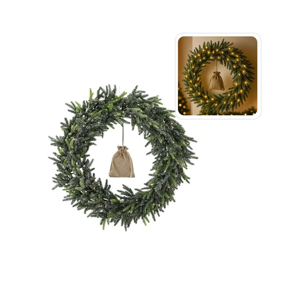 Ez az elegáns, 50 cm átmérőjű karácsonyi koszorú természetes hatású, hóborított fenyőágakból készült, amelyeket 50 darab meleg fehér mini led világítás díszít. A koszorú közepén egy zsákocska található, amely rusztikus karaktert ad a dekorációnak. A quot;próbáld kiquot; gombbal a világítás azonnal tesztelhető.Az elemes működésnek köszönhetően könnyen elhelyezhető bárhol ndash; ajtón, falon, ablakban vagy akár ünnepi asztaldíszként is.termékjellemzők:átmérő: 50 cmvilágítás: 50 db meleg fehér mini LEDtápellátás: 3 x AA elem (nem tartozék)funkció: quot;próbáld kiquot; gombmegjelenés: hófödte fenyőágak zsákos dekorralhasználat: beltéri