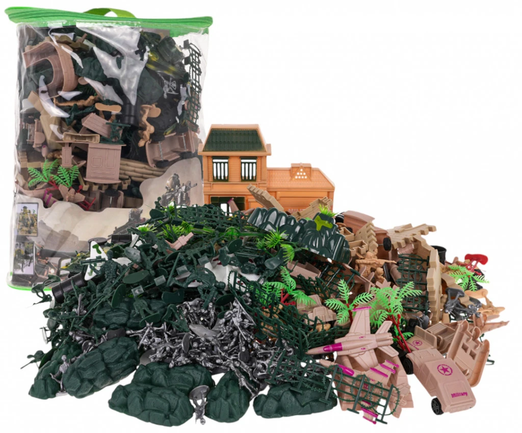 Átfogó katonai figurák és járművek készlet 3 éves kortól gyermekek számára. A készlet 400 darabot tartalmaz. Tökéletes egyéni vagy csoportos játékhoz, 250 katonát tartalmaz 3 színben és 2 méretben, valamint olyan járműveket, mint a tankok, páncélozott autók, terepjárók, repülőgépek, hajók, védőbázis, árkok, védő sziklák, falak, homokzsákok, szögesdrót kerítések és még olajoshordók is. Minden darab cipzáras tokban található. A készlet kiváló minőségű műanyagból készült, könnyű és ütésálló.Készlet jellemzői:- 3 éves kortól gyermekek számára készült,- gazdagon felszerelt, akár 400 elemet is tartalmaz,- kiváló minőségű anyagból készült,- cipzáras tok mellékelve.Méretek:- kb. 5,5 cm magas nagy katona,- kisebb katona, kb. 3,5 cm magas,- alap kb. 18 cm x 3,5 cm x 14,5 cm,- kb. 13 cm x 4,5 cm x 5 cm-es tartályok,- katonai autók kb. 6,5 cm x 3,5 cm x 3,5 cm,- nagyméretű repülők kb. 13,5 cm x 9 cm x 4 cm,- kisebb repülők kb. 9 cm x 7 cm x 2,5 cm,- hajók kb. 8,5 cm x 3,7 cm x 2 cm,- olajoshordó kb. 3,5 cm x 2,5 cm,- kb. 3 cm x 2 cm-es tartályok,- egy körülbelül 6 cm magas falelem,- szögesdrót elem kb. 11 cm x 3 cm,- homokzsákokkal ellátott elem kb. 11 cm x 2 cm x 2 cm,- kb. 8 cm x 5 cm-es fa,- védőkövek kb. 7 cm x 3 cm x 2,5 cm,- nagyobb védőkövek, kb. 11 cm x 6,5 cm x 4,5 cm,- kb. 7 cm x 2,5 cm-es puskák,- csomagolás kb. 15 cm x 25 cm x 32 cmA készlet tartalma:- 25 nagy, zöld katona,- 25 nagy sárga katona,- 100 kis zöld katona,- 100 kis ezüst katona,- alap,- 2 tank mozgatható ágyúkkal,- 8 db katonai autó,- 2 nagy repülőgép,- 8 kisebb repülőgép,- 2 hajó,- 16 hordó olaj,- 9 tartály,- 8 falelem,- 20 darab szögesdrót,- 6 homokzsákokból készült falelem,- 6 fa,- 21 védekező kő,- 4 nagyobb védekező kő,- 2 puska,- hordozófogantyús csomagolás.