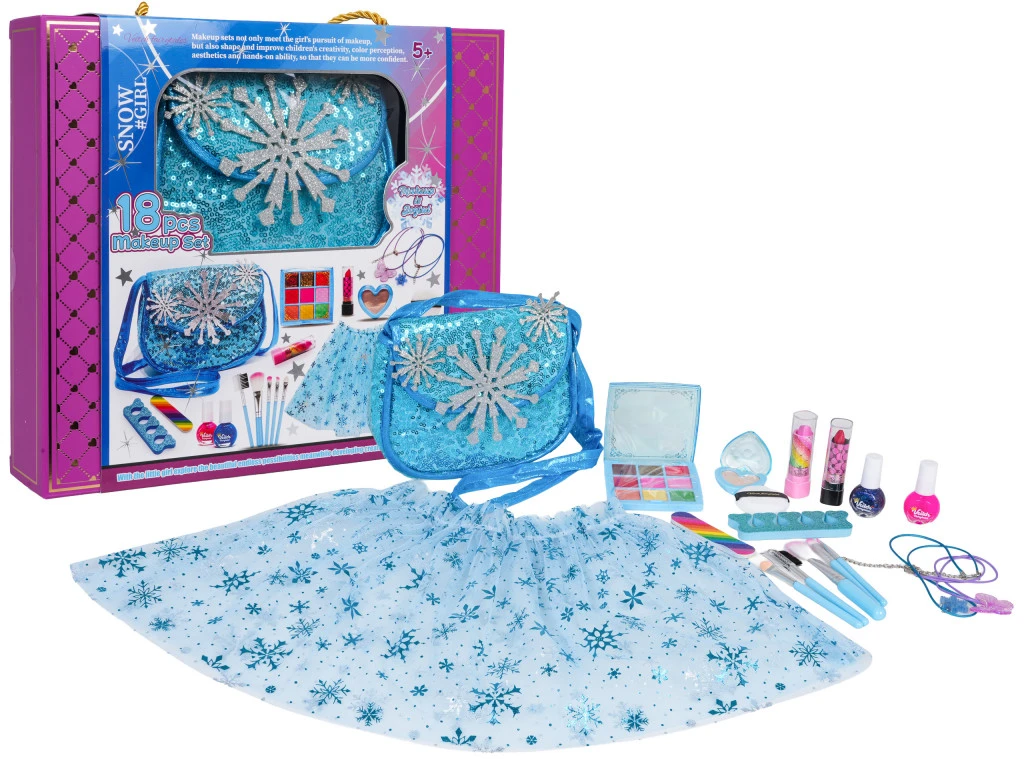 Gazdagon felszerelt, színes kis hercegnős készlet, szoknyával, kézitáskával és sminkkel öt éves kortól gyermekek számára. A készlet 18 darabból áll, aprólékos figyelemmel és a legkiválóbb minőségű anyagok felhasználásával kidolgozva. A kozmetikumok gyermekbiztosak, hipoallergének és könnyen eltávolíthatók. A készlet tartalmaz egy szemhéjfesték palettát, körömlakkokat, rúzsokat, sminkecseteket, egy gyönyörű kézitáskát, nyakláncokat és egy tüll szoknyát.Készlet jellemzői:- ötéves kortól gyermekek számára,- gyermekbarát anyagokból készült,- a kozmetikumok nagyon könnyen lemoshatók,- egy díszes táska, amelyben minden kozmetikumodat és sminkkellékedet tárolhatod,- mesés tüll szoknya,- mindezt egy fogantyús dobozba csomagolva, így ajándéknak is tökéletes.Méretek:- kb. 30 cm hosszú tüllszoknya, derékbőség kb. 20 cm x 2 – 40 cm x 2,- dísztasak kb. 18 cm x 13,5 cm x 6,5 cm,- nyaklánc kb. 24 cm hosszú,- paletta 9 db kb. 8,5 cm x 8,5 cm x 1,5 cm-es szemhéjfestékkel,- szemhéjfesték szív alakú dobozban, kb. 5 cm x 4 cm x 1 cm,- kb. 7,5 cm magas rúzs,- kb. 5,5 cm hosszú körömlakk,- kb. 11,5 cm hosszú sminkecset,- sminklemosó szivacs, kb. 4,5 cm átmérőjű,- kb. 10 cm x 3 cm-es ujjleválasztó,- kb. 9 cm x 2 cm-es körömreszelő,- csomagolás kb. 33 cm x 29,3 cm x 6,8 cm.A készlet tartalma:- tüll szoknya,- díszes táska,- 2 db nyaklánc,- egy paletta hat szemhéjfestékkel és három csillámos szájfénygel,- szemhéjfesték szív alakú dobozban,- 2 db rúzs,- 2 db körömlakk,- 4 db sminkecset és egy szemöldök- és szempilla ecset,- sminklemosó szivacs,- ujjleválasztó,- körömreszelő,- sminklemosó szivacs,- díszes csomagolás.