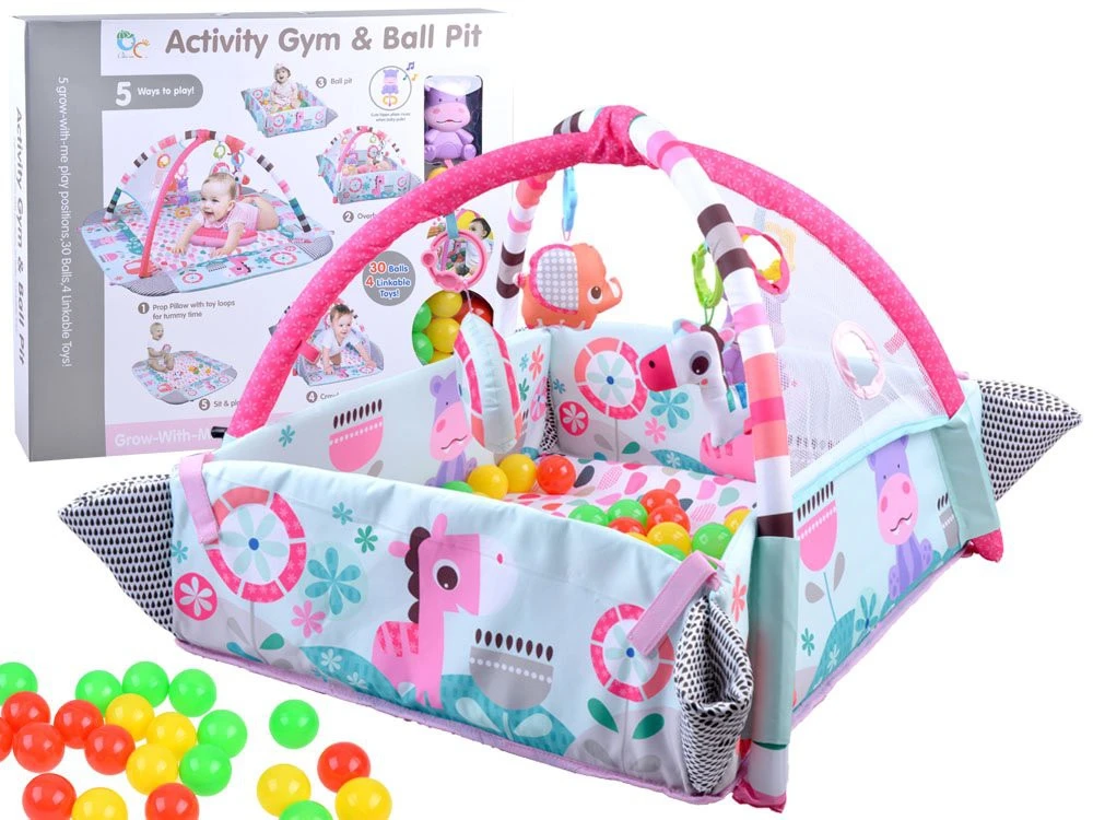 Zárt szőnyeg, azaz járókaelegendő a szőnyeg falainak felemeléséhez (tépőzárral vannak rögzítve), hogy játszóteret hozzanak létre egy ülő vagy mászkáló kisgyermek számára.A szettben található golyók még szórakoztatóbbá teszik a szórakozást.