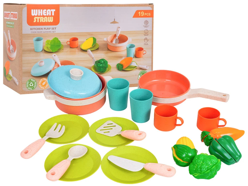 Környezetbarát edények és kiegészítők készlete hároméves kortól gyermekek számára. Bioműanyagból készült, 19 darabos készlet: edények és élelmiszer-utánzó anyagok. Az élénk színek vonzzák a gyerekek figyelmét és játékra ösztönzik őket.Jellemzők:- hároméves kortól gyermekek számára,- bioműanyagból készült,- a tökéletes készlet konyhai játékhoz és főzéshez.Méretek:- kb. 21 cm x 12 cm-es serpenyő,- fazék kb. 16 cm x 12 cm x 4,5 cm,- fedél átmérője kb. 12 cm,- kb. 10,5 cm átmérőjű tányér,- kb. 6 cm x 5 cm-es csésze,- kb. 6,5 cm x 4 cm-es csésze,- kanál és villa kb. 11 cm x 3 cm,- kb. 11 cm x 4,5 cm-es spatula,- kés kb. 13 cm x 3,5 cm,- kukorica kb. 8 cm x 5,5 cm,- sárgarépa kb. 9 cm x 3,5 cm,- zöldpaprika kb. 6 cm x 5 cm,- brokkoli kb. 6,5 cm x 6 cm,- csomagolás kb. 24 cm x 10 cm x 14 cm.