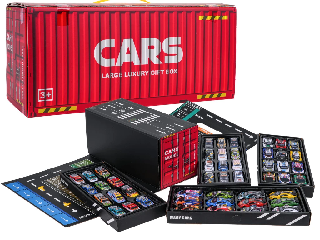 Jól felszerelt, autókkal és garázzsal ellátott készlet hároméves vagy annál idősebb gyermekek számára. A legmagasabb minőségű anyagokból készült készlet tartósságot és biztonságot garantál. A tartály alakú csomagolás egy nyitható, ötszintes garázst rejt 48 járművel, utakkal és parkolóhelyekkel. Játékidő után az összes autó visszahelyezhető a helyére, és a játék bárhová áthelyezhető a praktikus hordozófogantyúnak köszönhetően.Jellemzők:- hároméves kortól gyermekek számára,- a szett biztonságos, kiváló minőségű anyagokból készült,- 4 szintes garázs konténer alakú csomagban,- a színek gazdagsága,- a rugók gumikerekekkel és fém testtel rendelkeznek.Méretek:- autó kb. 7,5 cm x 3,8 cm x 2 cm,- kihajtogatatlan konténer, parkolási méret kb. 35,5 cm x 16 cm x 74,5 cm,- tartály/csomagolás kb. 35,5 cm x 15 cm x 16 cm.