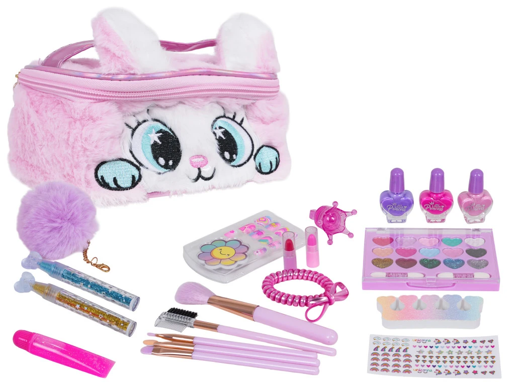 Egy kis stylistkészlet egy aranyos táskában hároméves kortól gyermekeknek. A plüss cicás táska olyan kincseket rejt, mint a körömlakkok, szemhéjfestékek, ecsetek, műköröm és még sok más. A készlet a legmagasabb minőségű, gyermekbiztos anyagokból készült. A kozmetikumok hipoallergének és könnyen eltávolíthatók; egyszerűen használjon szappant és vizet.Jellemzők:- hároméves kortól gyermekek számára,- biztonságos anyagokból készült,- könnyen mosható,- antiallergén,- gazdagon felszerelt,- egy gyönyörű kézitáska egy cicával.Méretek:- macskás táska kb. 18 cm x 8 cm x 13 cm,- szemhéjfesték paletta ecsetekkel, kb. 11 cm x 7,5 cm x 0,8 cm,- körömlakk kb. 5 cm x 3 cm x 1,5 cm,- szájfény kb. 8 cm x 2,5 cm-es tubusban,- 5 különböző, kb. 14 cm hosszú sminkecsetből álló készlet,- kb. 9,5 cm x 6 cm x 0,5 cm-es paletta műkörömmel és reszelővel,- sablon körömmatricákkal kb. 9,5 cm x 4,5 cm,- rúzs kb. 3,5 cm x 1 cm,- csillámos tároló kb. 10,5 cm x 1 cm,- ujjleválasztó kb. 8 cm x 3,5 cm,- egy kb. 7 cm átmérőjű táskához való pompon,- karkötő kb. 7 cm x 5 cm,- kb. 4,5 cm x 4 cm-es szájfényes gyűrű,- csomagolás kb. 18 cm x 14 cm x 9 cm.