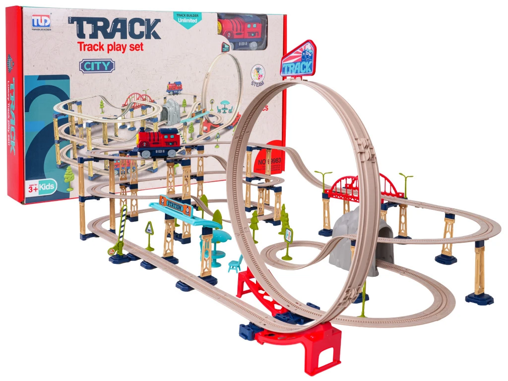 Teljes funkcionalitású építőkészlet, pálya és vonat három éves kortól gyermekek számára. A készlet 146 darabot tartalmaz, beleértve a pályaépítő elemeket, egy hurkot, hidakat, viaduktokat, matricákat, különféle kanyarokat és pályaelemeket, útjelző táblákat, fákat, alagutakat és egy 2 db 1,5 V-os AAA elemmel működő vonatot (nem tartozék). A vonat előrehalad a síneken, és valósághű hangokat ad ki.A készlet számos lehetőséget kínál összetett útvonalak létrehozására és azok fantáziád szerinti módosítására. Gyermeked kreativitást és térbeli tervezési készségeket fog mutatni. A készlet biztonságos és tartós anyagokból készült, így hosszú távú használatot biztosít.Jellemzők:- hároméves kortól gyermekek számára,- a szett tartós és biztonságos anyagokból készült,- a halmaz akár 146 eleme is lehet,- a készlet számos lehetőséget kínál kiterjedt útvonalak létrehozására,- kreativitást és térbeli tervezést tanít,- a vonat előrehalad a síneken, és valósághű hangokat ad ki.Méretek:- a sín összecsukás után kb. 87 cm x 51 cm x 36,5 cm,- vonat kb. 10 cm x 7,5 cm x 4 cm,- csomagolás kb. 46 cm x 6 cm x 26 cm.