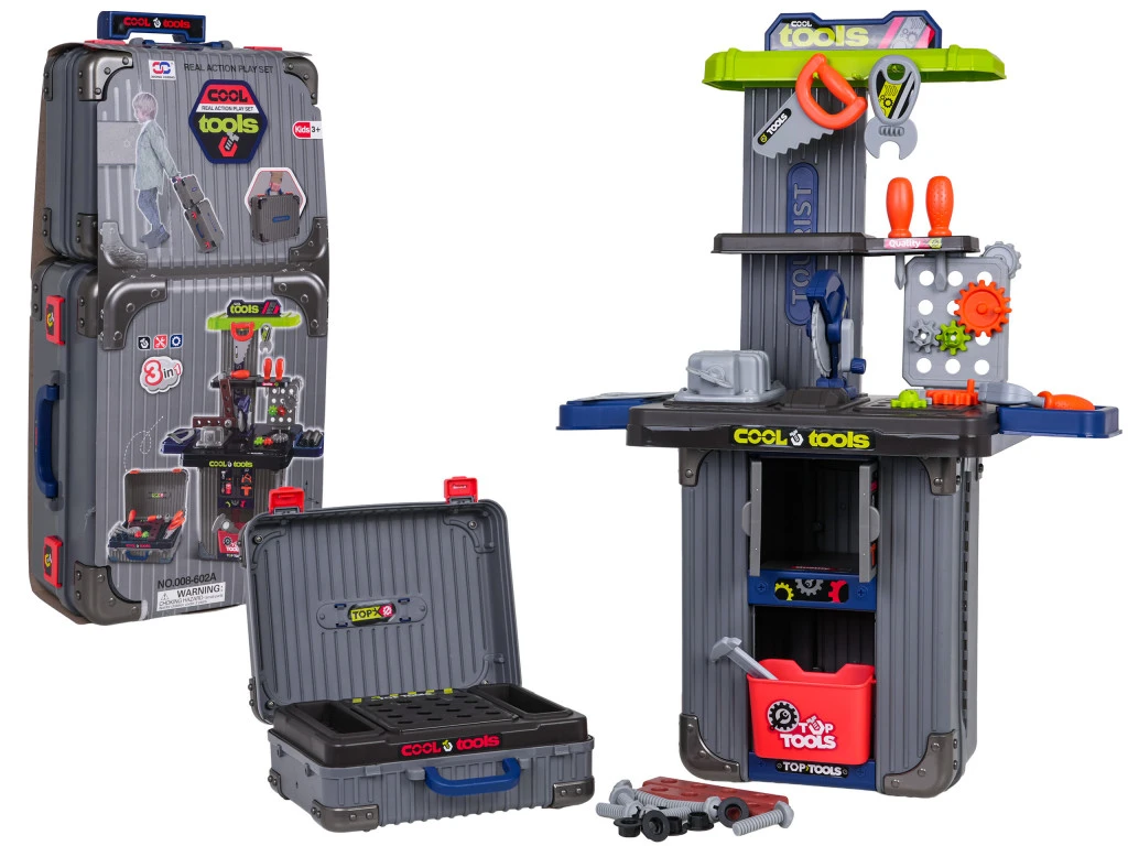 Jól felszerelt 3 az 1-ben készlet, két bőrönddel, amelyek hároméves kortól gyermekek számára műhellyé alakíthatók. A készlet kiváló minőségű műanyagból készült, amely ellenáll a nagy igénybevételnek. A bőröndök a műhely szerkezeti elemeit és tartozékait tartalmazzák, mint például fogaskerekek, satu, fűrész, csavarozóelemek, csavarok, csavarhúzók és még sok más.Jellemzők:- hároméves kortól gyermekek számára,- a legjobb minőségű műanyagból készült,- 2 db bőrönd, műhellyé alakítható,- számos műhelykiegészítő,- rengeteg lehetőség a kreatív játékra,- tökéletes ajándékcsomag.Méretek:- kisebb bőrönd kb. 23,5 cm x 19 cm x 10 cm,- nagyobb bőrönd kb. 53 cm x 23 cm x 13,5 cm,- összecsukás utáni műhelyméret kb. 66 cm x 48 cm x 24 cm,- csomagolás kb. 53 cm x 23 cm x 13,5 cm,- kb. 13 cm x 3 cm-es becsavarható elemek,- kb. 11 cm x 9 cm-es fűrész,- satu kb. 12,5 cm x 8 cm,- kb. 5,5 cm x 2,5 cm-es kupakok,- állítható szögmérő kb. 9 cm x 9 cm,- állítható villáskulcs kb. 8,5 cm x 4,5 cm,- tolómérő kb. 14 cm x 5,5 cm,- kb. 5,5 cm hosszú csavarok,- lapos, kereszt alakú és kalapács alakú hegy, kb. 6 cm hosszú,- kb. 2,5 cm átmérőjű rátétek,- a nagy fogaskerekek kb. 5 cm átmérőjűek, a kicsik kb. 2,5 cm átmérőjűek.