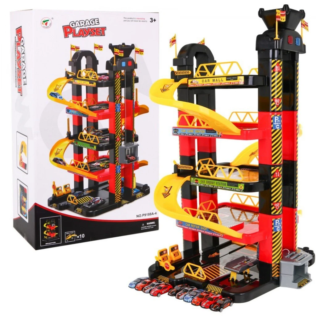 A parkolóház 5 szintből áll, amelyekhez lifttel vagy csúszdával lehet feljutni. Gyermeke sok látnivalóval találkozik az úton szintről szintre. Az alsó szinten autómosó, szervíz és benzinkút található. A 2,3,4 és az 5 szint parkolók. A tetején egy helikopterrepülő és egy villogó fényű, felfelé és lefelé közlekedő lift található, amelyet 3 x AA 1,5 V-os elem táplál.A játék 3 éves kortól gyermekeknek ajánlott.Készlet tartalma:többszintes parkoló10 autóútmutatómatrica készletMéretek:parkoló kb. 74 x 58 x 46 cmautó kb. 7 x 2 cmcsomagolás kb. 74 x 43 x 22 cm
