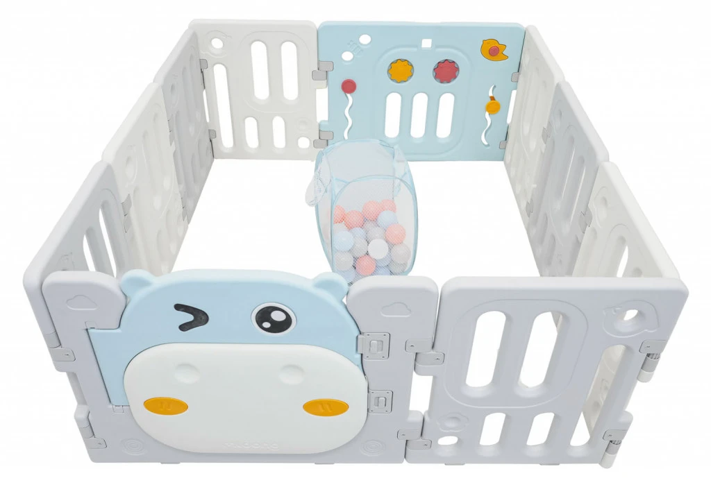 Nagy, praktikus, összecsukható moduláris játszótér 6 hónapos kortól gyermekek számára. A játszótérből bármilyen szerkezetet elrendezhetünk saját preferenciáink szerint, nagyon könnyen összecsukható és kinyitható, stabilés sima szélekkel rendelkezik. A játszótér belseje manipulatív elemekkel van felszerelve, mint például tolókerék, fogaskerekek, síp vagy kormánykerék. A készlet tartós és nem mérgező anyagokból készült, 10 panelből áll. Az ajtópanel záródik, megakadályozva, hogy a gyermek kívülről kinyissa az ajtót. A csúszásgátló lábak megakadályozzák a játszótér elcsúszását. A játszótérben a babának elegendő helye lesz a szabad mozgáshoz, miközben biztonságban van. A készlet tartalmaz egy labdatartó kosarat és 40 labdát is.Készlet jellemzői:- 6 hónaposnál idősebb gyermekek számára alkalmas,- lehetőség bármilyen méretű játszótér építésére az Ön igényei szerint,- manipulatív elemek a tollban: csúszó kerekek, fogaskerekek, síp a madárban és a kormánykerékben, forgó kormánykerék.- tartós és nem mérgező anyagokból készült,- külső ajtózár,- csúszásmentes lábak,- könnyen összecsukható és kibontható,- labdatartó kosár és labdák benne vannak.Méretek:- játszótér kb. 128 cm x 150 cm x 63 cm,- labdakosár kb. 47 cm x 29 cm x 24 cm,- labda átmérője kb. 7,5 cm,- csomagolás kb. 106,5 cm x 67,5 cm x 26,5 cm.