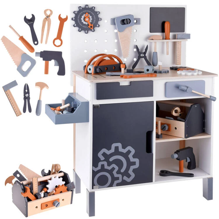 Nagyméretű fa barkácsműhely szerszámokkalEgy nagy faműhely egy kis barkácsolásrajongó számára egy időtlen, csodálatos játék, amely biztosan minden fiúnak tetszeni fog.A készlet sok fa részből és közel 55 kiegészítőből áll, és minden olyan elemmel fel van szerelve, ami egy profi műhelyben szükséges. Itt megtalálod többek között a munkához szükséges eszközöket; csavarhúzó, kalapács, csavarok, fogaskerekek, anyák, mérőedények, fogók, fűrész, kulcsok stb., valamint egy tágas szerszámosládát is, egy fekete krétatáblát és egy mozgatható mutatós órát.Ez az játék korlátlan szórakozást tesz lehetővé egy virágzó javítóműhelyben, játszhatsz a készlet egyes elemeivel, így nem lesz hamar unalmas a szórakozás.A játék teljes egészében fából készült, tökéletesen harmonizáló színekben: klasszikus fa, fehér, piros és a szürke több árnyalata, így bármilyen gyerekszobába alkalmas. Minden elem nagyon gondosan és esztétikusan, minden apró részletre odafigyelve készült, és biztonságos festékkel borították. A játék fából való elkészítése kétségtelen előny, mert növeli a játék esztétikai értékét, a használat biztonságát és kényelmét, valamint a készlet tartósságát és sérülésállóságát.A készlet korlátlan csavarozási, szögezési és összeszerelési lehetőséggel sok szórakozást nyújt a kis mesterembernek. A munkalap által kijelölt barkácszónának és a nyomtatott mérőszalagnak köszönhetően a gyermek megtanulja a munkaszervezést. Ilyen berendezéseknél a meghibásodás nem probléma! Most apa és nagypapa támogatást kap egy kis ezermester formájában. Ideje elkezdeni a trükközést!A készlet tartalma: