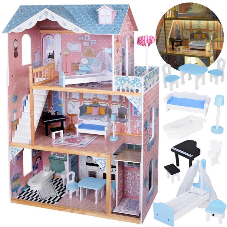 Nagyméretű háromszintes fa babaház bútorokkal rózsaszín falakkalNagyon nagy, fából készült babaház, pasztell színekben ndash; egy csodálatos játék, tartósan megépített!Ez a bájos babaház erős fakerettel és gyengéd pasztell színpalettával készült. Tökéletes egy kis hercegnő szobájába! A babaház kétszintes és egy földszintes, különféle kényelmi szolgáltatásokkal szolgálva apró lakóinak. Még ablakokkal is rendelkezik, amelyeken keresztül be lehet nézni a babákhoz, és ez a valósághű megjelenést kölcsönzi.- Földszint: egy fürdőszoba és egy konyha étkezővel, valamint hozzáférés a lifthez.