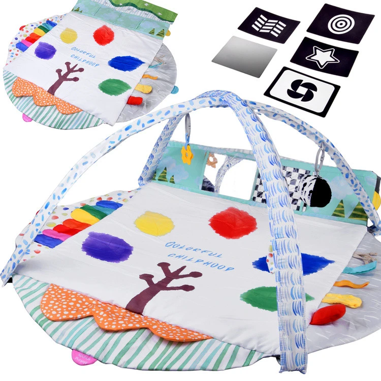 Nagy 2 az 1-ben oktató játszószőnyeg kerek, szuper puha, interaktív babáknakMiért válassza a játszószőnyegünket?Tágas és szuperpuha felület ndash; a kivételesen finom anyagból készült nagy, kerek szőnyeg kényelmet és biztonságot nyújt a kicsinek fekvés, ülés vagy mászás közben. Tökéletes az érzékeny bababőr számára.2 az 1-ben ndash; játszószőnyeg és aktivitásteremÍvekkel ellátott oktatószőnyeg: két rugalmas ív alkot játékkarikát, szövetborítással.Önálló játszószőnyeg: az ívek eltávolítása után kényelmes hellyé válik a hasonléthez és a szabad játékhoz.Interaktív függőjátékok ndash; a készlet tartalmaz egy tükröt, rágókát, plüssjátékot, kontrasztkártyákat és egyebeket. Serkentik a baba érzékszerveit, ösztönözve a nyúlásra, a megfogásra és a felfedezésre.Stimuláló dizájn ndash; a kontrasztos minták, a gyűrött anyagok és a színes részletek felkeltik a baba figyelmét, miközben fejlesztik a vizuális, hallási és tapintási érzékelést.Könnyen összeszerelhető és tárolható ndash; könnyű szerkezetének köszönhetően gyorsan összecsukható és kényelmesen hordozható útközben.Könnyen tisztítható ndash; a higiénikus anyagok biztosítják, hogy a szőnyeg könnyen karbantartható és friss maradjon.Az oktató jellegű játszószőnyeg használatának előnyei:Motoros fejlődés ndash; támogatja a megfogás, rúgás, átfordulás és a fej felemelésének megtanulását.Érzékszervi stimuláció ndash; a különféle textúrák, színek és hangok fejlesztik a látást, a hallást és a tapintást.Biztonságos környezet ndash; a puha és stabil konstrukció biztonságos játékteret teremt.Szülői támogatás ndash; értékes, fejlesztő játékban tartja a babát.Specifikációk:Méretek: 125 x 110 x 1 cmAnyag: szuper puha, bababarát szövetA készlet tartalma: szőnyeg, 2 db ív, interaktív függőjátékok (tükör, kontrasztkártyák, csillag alakú rágóka, puha kontrasztlabda, csörgő, gyűrődő elemek).Oktatójáték szőnyeg ndash; praktikus és kényelmes választás babáknakA játszószőnyeg minden babakelengye egyik nélkülözhetetlen kelléke. Ez a szett kiváló választás, mivel ötvözi a praktikumot, a kényelmet és a funkcionalitást. Puha, biztonságos, könnyen tisztítható, és ami a legfontosabb ndash; a gyermekkel együtt növekszik, alkalmazkodva a fejlődés minden szakaszához.