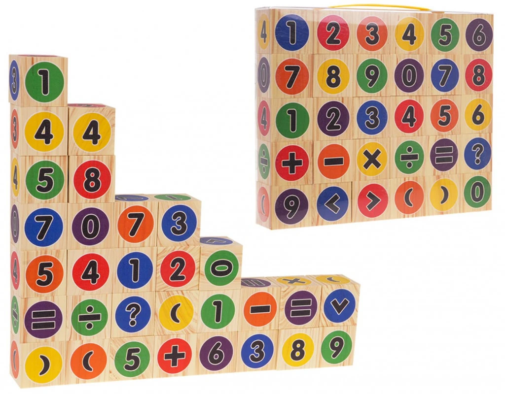 Oktató fakockákból álló készlet 3 éves kortól gyermekek számára a számolás elsajátításához. A készlet 30 darab kockát tartalmaz 0-9 közötti számokkal és matematikai szimbólumokkal. A készlet segít a színek felismerésében és az egyszerű matematikai műveletek elvégzésében.Készlet jellemzői:- 3 éves kortól gyermekek számára készült,- habszivacsból készült,- hasznos a matematikai műveletek és a színek tanulásábanMéretek:- kb. 5 cm x 5 cm x 5 cm-es blokk,- csomagolás kb. 30,5 cm x 25,5 cm x 5 cm