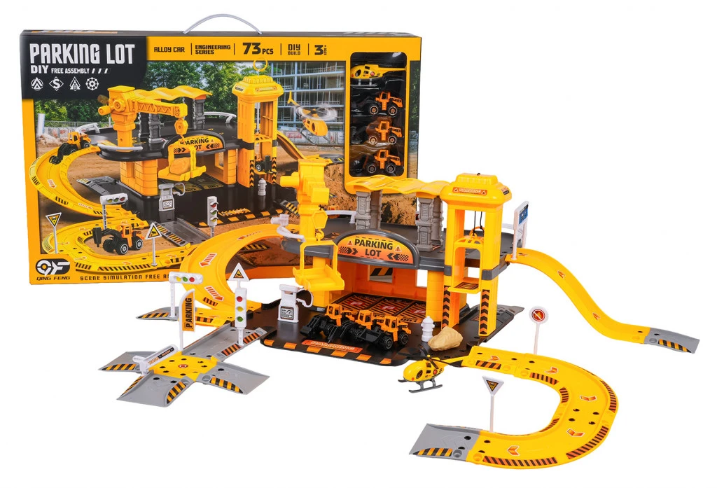 Ez az építkezéssel és építőipari járművekkel ellátott parkoló tökéletes hároméves vagy annál idősebb gyermekek számára. Minden elem a legmagasabb minőségű, gyermekbiztonságos anyagokból készült. A parkoló örömet okoz az építőipar szerelmeseinek. A parkoló kétszintes. A földszinten található egy benzinkút, egy út és egy kézi lift, amely a járműveket az első emeletre szállítja, ahol egy mozgatható daruval ellátott építkezés található. A járművek a lift vagy a csúszda segítségével ereszkedhetnek le a tetejéről. A készlet három fémszerkezeti járművet és egy helikoptert tartalmaz. Összeszerelés után a készlet kevés helyet foglal, és számos játéklehetőséget kínál.Jellemzők:- hároméves kortól gyermekek számára,- a halmaz akár 73 eleme is lehet,- a legmagasabb minőségű, gyermekek számára biztonságos anyagokból készült,- mozgatható emelő (kézi),- 3 építőipari jármű és egy helikopter is benne van a csomagban,- fém karosszériás és mozgó alkatrészekkel rendelkező járművek,- a tökéletes készlet szerepjátékhoz.Méretek:- parkoló kb. 65,7 cm x 54 cm x 20 cm,- építőipari járművek kb. 7 cm x 3 cm x 3 cm,- csomagolás kb. 54,5 cm x 9 cm x 34 cm