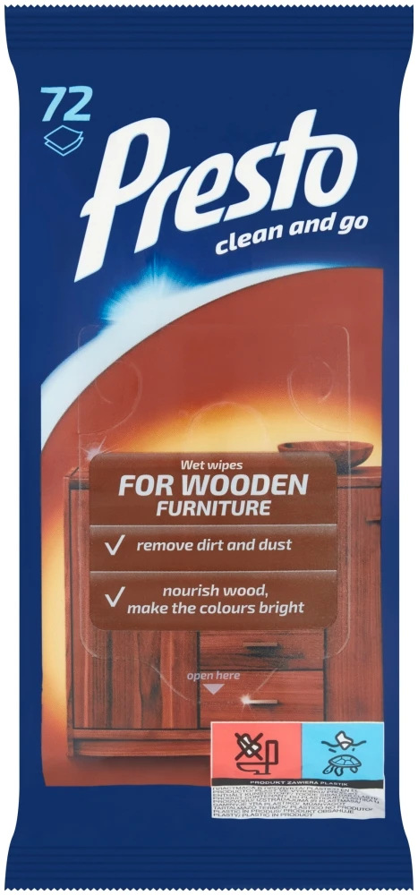 • A Presto bútorápoló nedves törlőkendők fából és fautánzatokból készült bútorok tisztításához készültek. Az ápoló olajjal gazdagított törlőkendők hatékonyan távolítják el a port és a szennyeződéseket, fényes felületet hagyva a használat után.