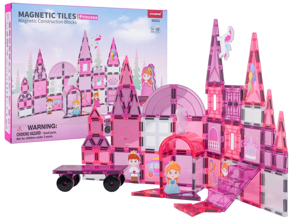 Mágneses kockákból álló készlet hercegnői kastély építéséhez, három éves kortól ajánlott. A készlet 58 darabból áll, mágneses kockákból, valamint egy herceg, királynők, egy unikornis és egy nyuszi mágneses figurájából. A mágneses kockák tartós műanyagból készültek, és neodímium mágnesekkel kapcsolódnak egymáshoz. Különböző konfigurációkban és különböző szögekben összekapcsolhatók, így 3D-s szerkezeteket hozhatnak létre. A kockák egymásra rakása pozitívan hat a kreativitásra, és türelmet és koncentrációt tanít.Jellemzők:- 58 elemből álló készlet egy hercegnői kastély építéséhez,- hároméves kortól gyermekek számára,- a blokkok jól illeszkednek egymáshoz és stabil szerkezetet hoznak létre,- különféle struktúrákat tudsz kialakítani,- a készlet fejleszti a kreativitást, megtanít a koncentrációra és a türelemre.Méretek:- összeszerelés utáni minta szerkezet kb. 55 cm x 36 cm x 16 cm,- mágneses blokkok, négyzetek, kb. 7,5 cm x 7,5 cm x 0,8 cm,- mágneses blokkok, apró négyzetek, kb. 3,8 cm x 3,8 cm x 0,8 cm,- mágneses háromszögek kb. 14 cm x 7,5 cm x 0,8 cm,- mágneses blokkok, kis háromszögek, kb. 3 cm x 3,5 cm x 0,8 cm,- kb. 3,5 cm átmérőjű körök,- kb. 8 cm x 3,5 cm-es karakterblokkok,- csomagolás kb. 41,5 cm x 6 cm x 31 cm.
