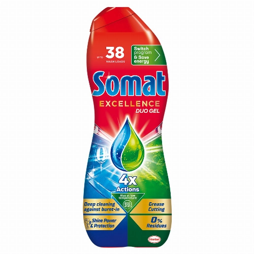 • Somat Excellence Duo Gél – a legjobb Somat mosogatógél formulánk, mely hatékonyan tisztít és ragyogó edényeket biztosít, alacsony hőmérsékletű ECO vagy alacsony hőmérsékletű rövid mosogatási programok használata esetén is, melyek során akár 20% energiát is megtakaríthat. Ragyogást és védelmet biztosít a kemény víz okozta foltoktól. Az egyedülálló kétkamrás flakon segítségével a Somat két hatékony formulát egyesít az erőteljes zsíroldóhatás, valamint az odaégett szennyeződések eltávolítása érdekében.
