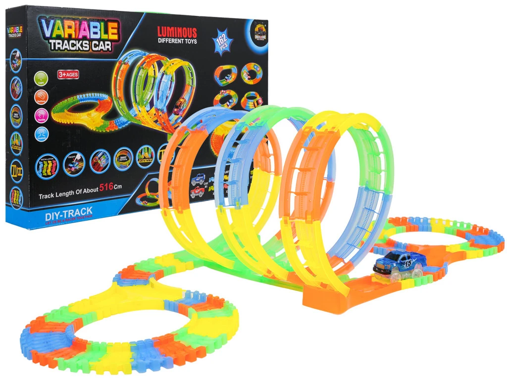 Ez a sötétben világító, hurkokkal és autóval ellátott versenypálya tökéletes három éves kortól a gyerekek számára. A pályák rugalmasak és bármilyen kombinációban elrendezhetők, forgathatók, emelhetők és áthelyezhetők menet közben.Ezenkívül a pályák fluoreszkálóak, azaz világítanak a sötétben. A mellékelt jármű LED-világítással rendelkezik, ami lenyűgöző hatást kelt sötétben vezetés közben. A járművet 2 db AA 1,5 V-os elem működteti (nem tartozék). Az autó indításához egyszerűen nyomja meg a tetején található gombot.Jellemzők:- hároméves kortól gyermekek számára,- a sínek rugalmasak és bármilyen kombinációban elrendezhetők,- a sínek világítanak a sötétben,- akkumulátoros autó fényhatással,- a pálya teljes hossza 516 cm.Méretek:- teljes pályahossz 516 cm,- autó kb. 9,5 cm x 6 cm x 5,5 cm,- pálya hossza kb. 148 cm x 57 cm x 32 cm,- csomagolás kb. 54 cm x 7 cm x 35 cm.