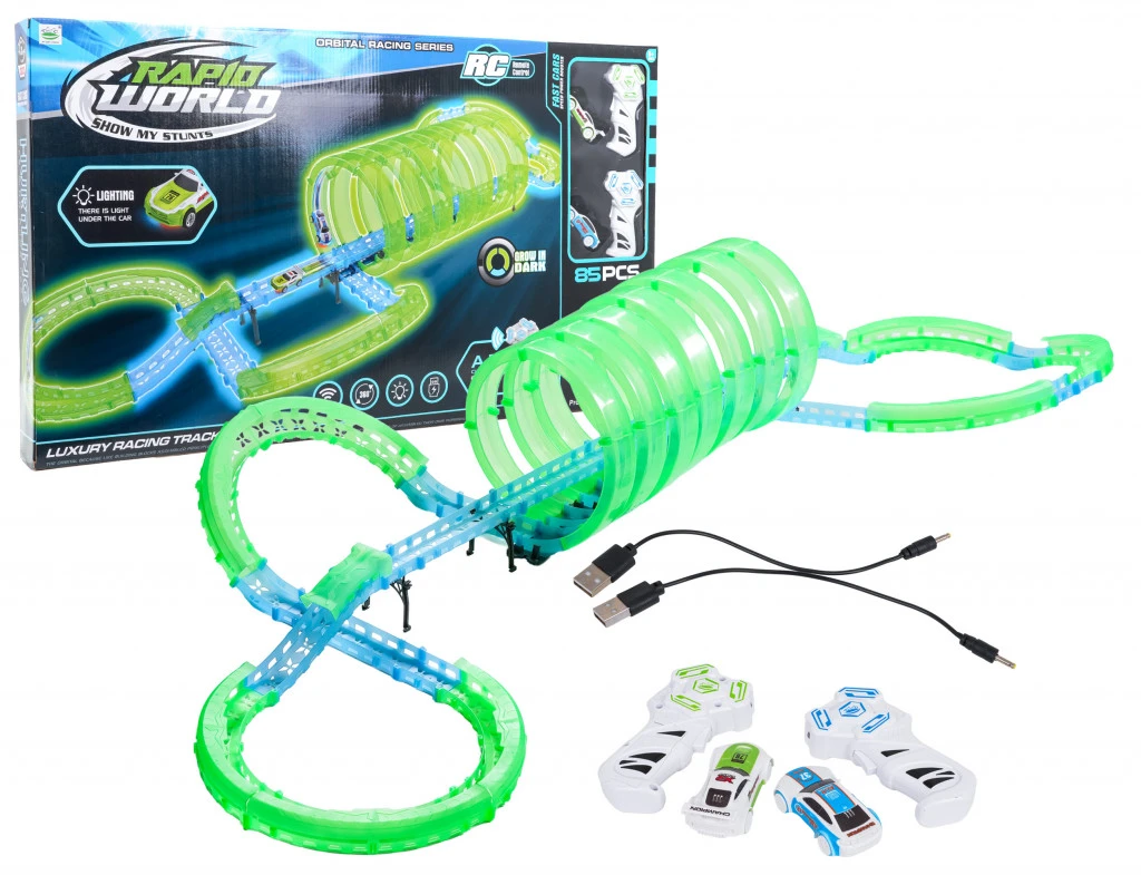 Ez a nagyméretű, sötétben világító versenypálya tökéletes hat éves vagy annál idősebb gyermekek számára. A készlet két távirányítót, két autót és pályaépítő elemeket tartalmaz. A távirányítókat 4 db AAA elem (nem tartozék), míg az autókat 3,7 V-os elemek (tartozék) működtetik.A pálya fluoreszkáló és sötétben világít. Az autók LED-világítással rendelkeznek, amely lenyűgöző hatásokat kelt vezetés közben. A pályán való játék fejleszti a szem-kéz koordinációt, míg a pálya építése serkenti a gyermek képzelőerejét és fejleszti a kézügyességet.Készlet jellemzői:- hatéves kortól gyermekek számára,- a fluoreszkáló pálya világít a sötétben,- távirányítású autók,- az autók LED-es háttérvilágítással rendelkeznek,- a pályán több 360 fokos hurok található.Méretek:- pálya kb. 158 cm x 71 cm x 26 cm,- autó kb. 7 cm x 3,5 cm x 2,5 cm,- távirányító kb. 11 cm x 6 cm x 3 cm,- csomagolás kb. 77 cm x 44 cm x 6,5 cm.
