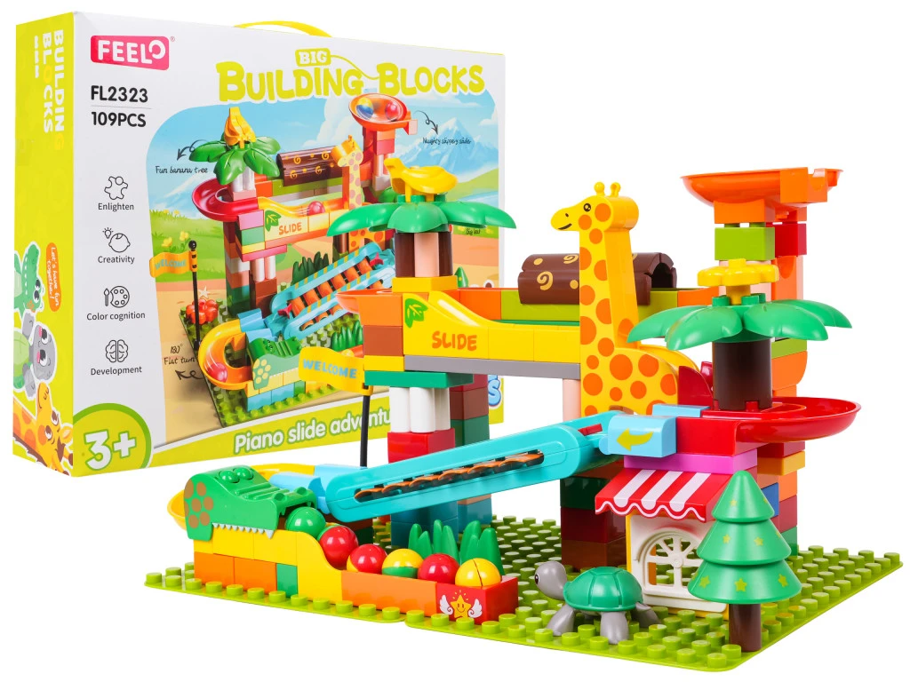 Szafari témájú építőjáték zenei elemekkel három éves kortól gyermekek számára. A készlet 109 darabból, különböző formájú és méretű kockákból, egy csúszdából és cintányérokból áll. Egy színes szafari parkot építhetsz egy golyócsúszdával. További vonzerőt jelentenek a beépített cintányérok. A golyók gurulnak rajtuk, élénk ritmust keltve. Az összeszerelés egyszerű és élvezetes. A kockák kiváló minőségű, gyermekbiztos műanyagból készültek. A kockák fejlesztik a finommotoros készségeket és a kéz-szem koordinációt.Jellemzők:- hároméves kortól gyermekek számára,- 109 halmazelem,- labdacsúszda,- beépített cintányérok,- egyszerű és kellemes összeszerelés,- fejleszti a motoros készségeket és a kéz-szem koordinációt.Méretek:- összeszerelés után kb. 38 cm x 23 cm x 26 cm,- golyó átmérője kb. 2,5 cm,- csomagolás kb. 39 cm x 9 cm x 30 cm.