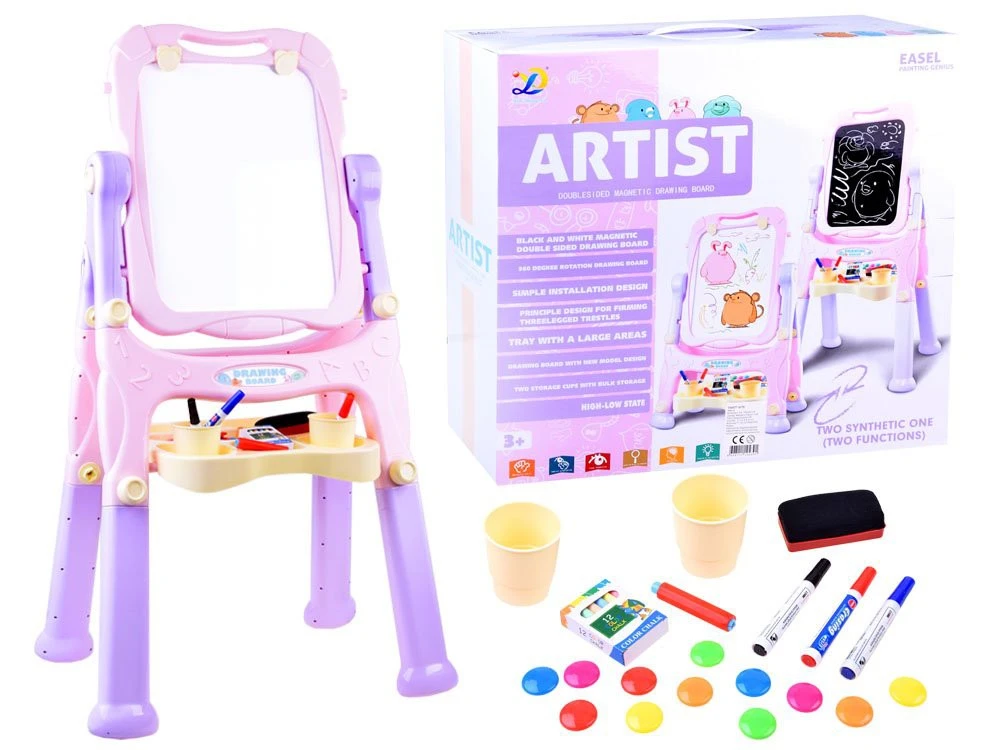 Ez a színes, interaktív tábla minden gyerekszoba elengedhetetlen terméke. A termék teljes egészében pasztell színű műanyagból készült. A tábla két oldallal rendelkezik, a fekete oldalon krétával, a fehéren filccel tud rajzolni gyermekünk. Utóbbira mágnesek is helyezhetőek. Továbbá található rajta egy tálca, amelyre az eszközök kényelmesen elhelyezhetőek.A táblán lehet:* Mágneseket elhegyezni, azokkal papírlapokat rögzíteni* Festékkel festeni* Krétával rajzolni* Tetszés szerint alkotni :)A tábla segít gyermekünknek az ötletei megvalósításában, valamint a kreativitás fejlesztésében.A készlet tartalma:* Mágneses tábla* Mágnesek* Szivaccsal szárazon törölhető filcek* Színes kréta* Krétafogó* Poharak ecsetek tárolásához* Polc ezek tárolásáhozA termék méretei:* Magasság: 111 cm* Szélesség: 52 cmRajzfelület méretei:* Szélesség: 30,5 cm* Magasság: 41 cm* Polc mérete: 37,5 x 37 x 3,5 cm