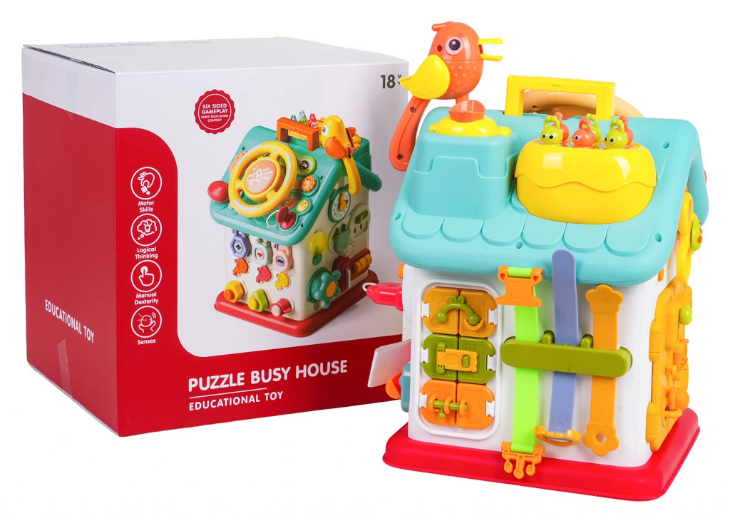 Multifunkcionális, interaktív játszóház babáknak tizennyolc hónapos kortól. Kiváló minőségű műanyagból készült, a játszóház színes és tele van funkciókkal. A manipulatív, fény- és hangelemek több szinten stimulálják a kicsiket. A játék 3 db AA 1,5 V-os elemmel működik (nem tartozék).A ház falainak és tetejének leírása.1.A ház tetejeA ház tetején egy megvilágított kormánykerék található kürttel, sebességváltóval, tükörrel, irányjelzőkkel és kulccsal ellátott gyújtáskapcsolóval. Két hanggomb is található, különböző dallamokkal és riasztásokkal. Kinyithatod és becsukhatod a tükröt, elfordíthatod a kormánykereket, sebességet válthatsz, elfordíthatod a kulcsot, és aktiválhatod az indexeket. Minden műveletet járműhangok kísérnek.A tető másik oldalán egy madár eteti a fiókáit. A tető tetején egy kihúzható hordozófogantyú található.2.Egy fal kulcsokkal, zárakkal és gombokkalA kisgyerek három kulcsa és három zárja áll rendelkezésére. A kulcsnak illeszkednie kell a zárhoz. Lent láthatók a gombok.3.Falióra konnektorral, villanykörtével és gombbalAz órának mozgatható mutatói vannak. A foglalatba dugott dugó megvilágítja az izzót. Van egy villanykapcsoló is, egy elforgatható és kicsavarható elem.4.Egy fal ajtóval, csengővel és forgóvalAz ajtók három különböző típusú zárral nyithatók. A csengő gombjának megnyomása csengő hangot ad. Ezen a falon található a be-/kikapcsoló és a hangerőszabályzó.5.Fal 3 nyitható ablakkal éslécekkel.A kisgyermek 3 különböző módon nyitja az ablakokat, és vannak hevederek is, amelyek mindegyike másképp van rögzítve.Jellemzők:- tizennyolc hónapos kortól gyermekek számára,- a legjobb minőségű anyagokból készült, élénk színekben,- nincsenek éles végei,- hangeffektusok: csengőhang, vezetési hang, kürt, állathangok, indexhangok, járműindítási hangok, riasztások, vidám dallamok,- fényeffektusok: indexek (zöld és piros), kormánykerék kürtje,- manipulációs hatások: forgatás, nyomás, csúsztatás, nyitás, zárás, csavarás, illesztés, behelyezés, húzás.Méretek:- ház kb. 21 cm x 21 cm x 32 cm,- csomagolás kb. 25,5 cm x 28,5 cm x 23,5 cm