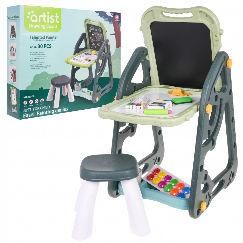 Multifunkcionális tábla székkelEz a nagyméretű, multifunkcionális készlet két táblából áll: egy krétával rajzolható táblából és egy mágneses táblából, valamint egy székből, és 3 éves kortól alkalmas gyermekek számára. A táblakeret kétféleképpen állítható be. Az első változatban az egyik oldalon egy mágneses, a másikon egy krétával rajzolható tábla található. A táblák magassága is állítható. A második változatban egy asztal található, tetején és a mellette lévő falon két táblával. A fehér oldal filctollal való írásra vagy színes mágnesek felhelyezésére használható. A fekete oldal krétával való rajzolásra és színes mágnesek felhelyezésére is használható.A készlet két polcot tartalmaz a festési kellékeknek és kiegészítőknek, például vizespohárnak, krétának, filctollaknak, mágneseknek stb.A készlet biztonságos, minden éle lekerekített a biztonságos használat érdekében. Könnyen összeszerelhető és szétszerelhető. A deszkának köszönhetően a gyerekek játék közben egyszerre serkenthetik képzelőerejüket, koncentrációjukat és kézügyességüket.Méretek:- asztali helyzetben kb. 72 cm x 43,5 cm x 39,5 cm,- helyezzen egy deszkát az egyik oldalra, a másikat a másikra, kb. 75 cm x 39,5 cm x 43,5 cm- a legalacsonyabb deszkával együtt kb. 58 cm x 43,5 cm x 39,5 cm,- zsámoly kb. 23,5 cm x 25 cm,- krétacsomag kb. 8,5 cm x 6 cm x 2 cm,- krétatartó kb. 9 cm x 2 cm,- egy körülbelül 11,5 cm hosszú filctoll,- kb. 8 cm x 8 cm-es csésze,- csomagolás kb. 59 cm x 50 cm x 13 cm.A készlet tartalma:- a készlet építőelemei,- szék,- kiegészítők: bögre, filctollak, mágnesek, krétatartó, kréta, szivacs.