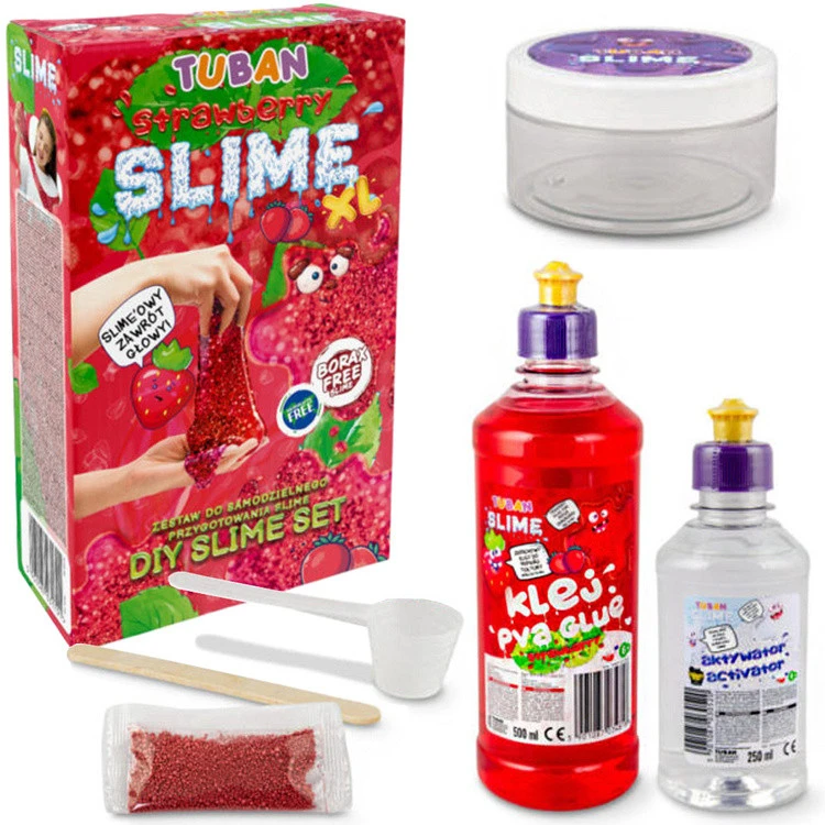 A TUBAN Slime XL Strawberry készlete tökéletes választás azoknak a gyerekeknek, akik szeretnek kísérletezni! A Slime egy népszerű játék a gyerekek körében, és ennek a készletnek köszönhetően teljesen egyedül is elkészítheti saját iszapját. A Strawberry modell minden bizonnyal kiemelkedik a nyálka teljes palettájáról. Miért? Eper illata van, csillámos részecskékkel csillog és rendkívül rugalmas.A készlet tartalma:500 ml piros PVA ragasztó250 ml aktivátor2,5 g vörös ásványi csillám,spatulatároló tartályUTASÍTÁS:Öntsön 200 ml piros PVA ragasztót egy tálba/tartályba.Lassan adjunk hozzá 100 ml aktivátort. Keverje össze a Slime-ot, amíg a massza el nem kezd elválni az edény falától.A Slime-ot addig gyúrjuk, amíg tökéletes állagot nem kapunk. Ha még mindig túlságosan a kezedhez tapad, adj hozzá még egy kis aktivátort.A Slime készen áll!A termék biztonságos a gyermekek számára. Nem tartalmaz bóraxot, mikroműanyagot és semmilyen mérgező anyagot!A készlet esztétikus, színes csomagolásba van csomagolva, ajándéknak is tökéletes.