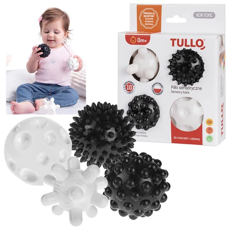 Négy puha szenzoros labdából álló készlet elengedhetetlen kellék az érzékszervi gyakorlatokhoz és szórakozáshoz. A labdák különböző méretüknek és textúrájuknak köszönhetően más-más érzetet biztosítanak. A Tullo szenzoros labdákat a gyógytornászok csecsemők izomlazító masszázsára ajánlják. A fekete-fehér színkombináció tökéletesen serkenti egy olyan baba látását, aki még nem tud különbséget tenni a színek között. A Tullo szenzoros labdák nem rendelkeznek lyukakkal, így tökéletesek a fürdéshez. A gyerekek csak a játék külső rétegével érintkeznek, így még higiénikusabb a kicsi számára.