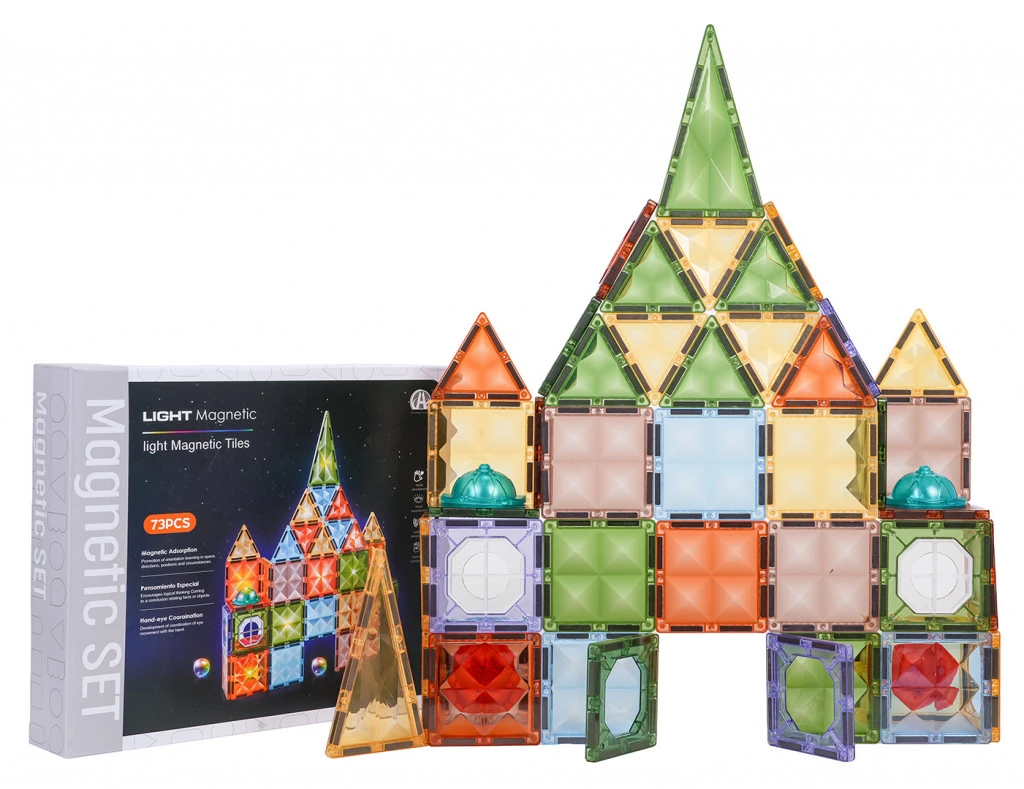 Átfogó, világító mágneses építőkocka-készlet hároméves vagy annál idősebb gyermekek számára. A készlet mágneses kockákat, matricákat, matricákat és világító korongokat tartalmaz. A mágneses kockák tartós műanyagból készültek, és neodímium mágnesekkel vannak összekapcsolva. Különböző konfigurációkban és különböző szögekben összekapcsolhatók, így 3D-s szerkezeteket hozhatnak létre. A kockák egymásra rakása pozitívan hat a kreativitásra, türelmet és koncentrációt tanít. A korongok LR1130 elemekkel működnek, összesen 12 darabbal (tartozék).Jellemzők:- 75 elemből álló, gazdagon felszerelt készlet,- hároméves kortól gyermekek számára,- a színek gazdagsága vonzza a gyermek tekintetét,- dekoratív matricák,- a blokkok jól illeszkednek egymáshoz és stabil szerkezetet hoznak létre,- különféle struktúrákat tudsz kialakítani,- a világító golyók varázst kölcsönöznek az egész szettnek,- a készlet fejleszti a kreativitást, megtanít a koncentrációra és a türelemre.Méretek:- mágneses blokkok, négyzetek, kb. 7,5 cm x 7,5 cm x 0,8 cm,- mágneses blokkok, kisebb háromszögek, kb. 7 cm x 6,5 cm x 0,8 cm,- mágneses blokkok, nagyobb háromszögek, kb. 13,5 cm x 7,5 cm x 0,8 cm,- kb. 6 cm átmérőjű korongok,- csomagolás kb. 30 cm x 6 cm x 25,5 cm.